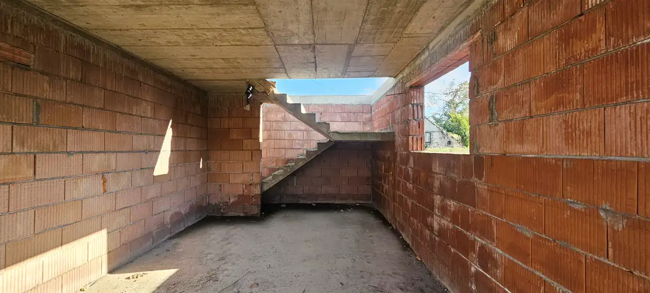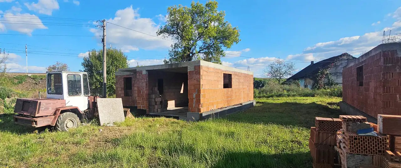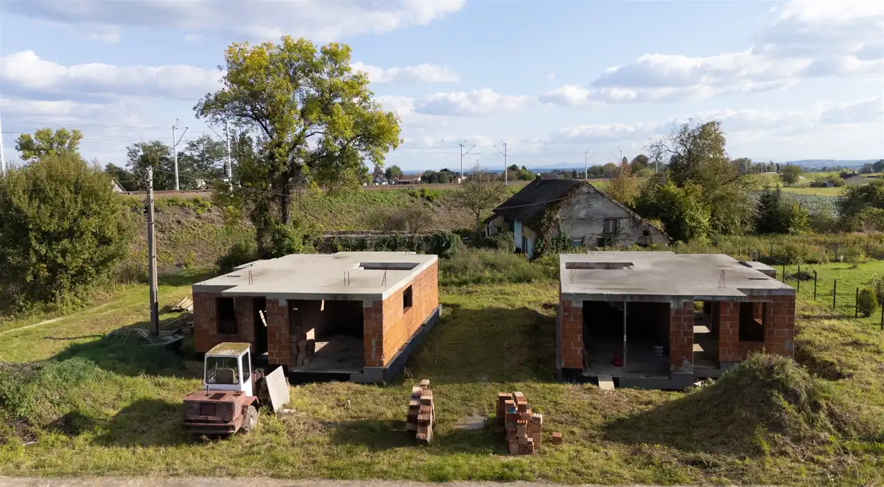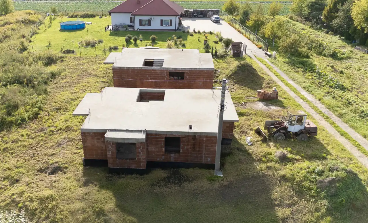 The house was designed based on the “Bella” project by Studio Krajobrazy. It is situated on a rectangular, well‑sunlit plot. Usable floor area: 114.29 m² + garage 25.71 m² Total floor area: 146.25 m², including structural elements (walls, chimneys, balconies). At this stage, modifications to internal partition walls are possible. An easement for access to the plot has been established.