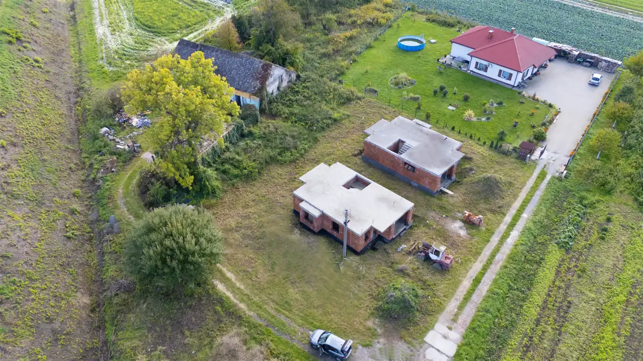 The property is situated in a quiet, green part of Kraków, in the second building line from the asphalt road. Nearby are public transport stops (MPK Kościelniki – lines 171 and 271), national road No. 79, and the Pleszów tram and bus terminal, reachable in 5 minutes by car or 15 minutes by bus. The area is characterized by low-rise housing and the presence of agricultural and forested land. The location ensures convenient access to urban infrastructure while offering peace and proximity to nature.