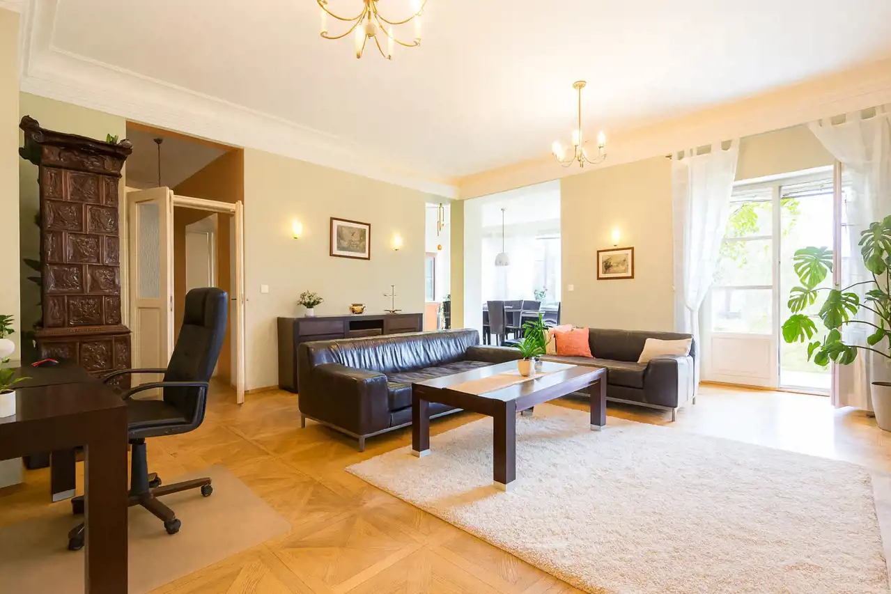 Parter to przestrzeń stworzona z myślą o komforcie i klimacie – przestronny salon z kominkiem z piaskowca oraz zabytkowym piecem secesyjnym (z możliwością podłączenia ogrzewania elektrycznego), otwarta kuchnia połączona z jadalnią, biblioteka z opcją wydzielenia dwóch pomieszczeń, przytulna sypialnia z garderobą, przestronna łazienka z narożną wanną i prysznicem, oddzielna toaleta, kotłownia oraz garaż na dwa auta.