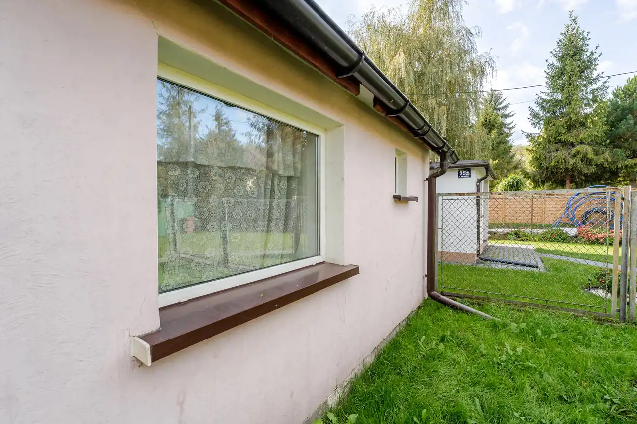 Dom położony jest na działce o powierzchni 6,21a, na której znajduje się również niewielki budynek gospodarczy – może pełnić funkcję garażu, magazynku lub warsztatu.