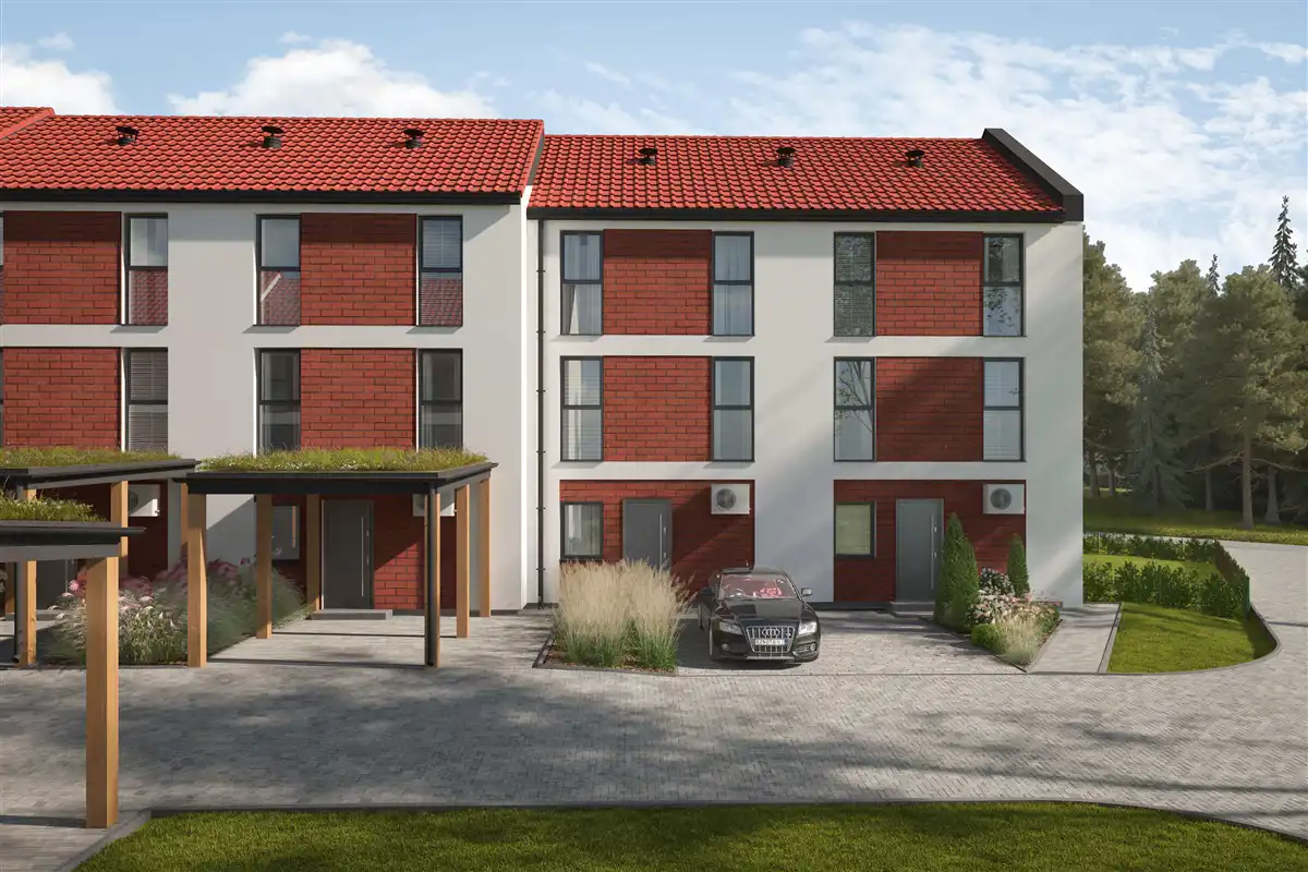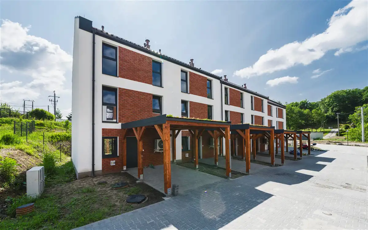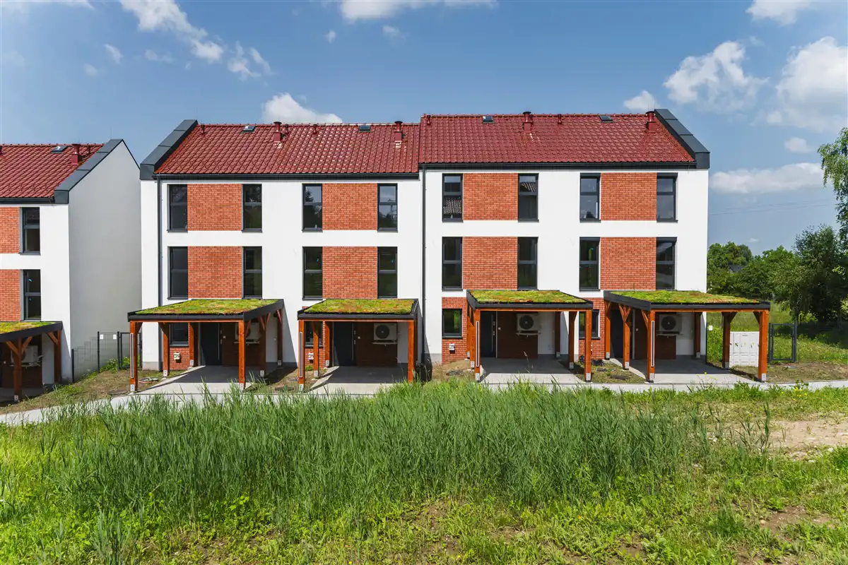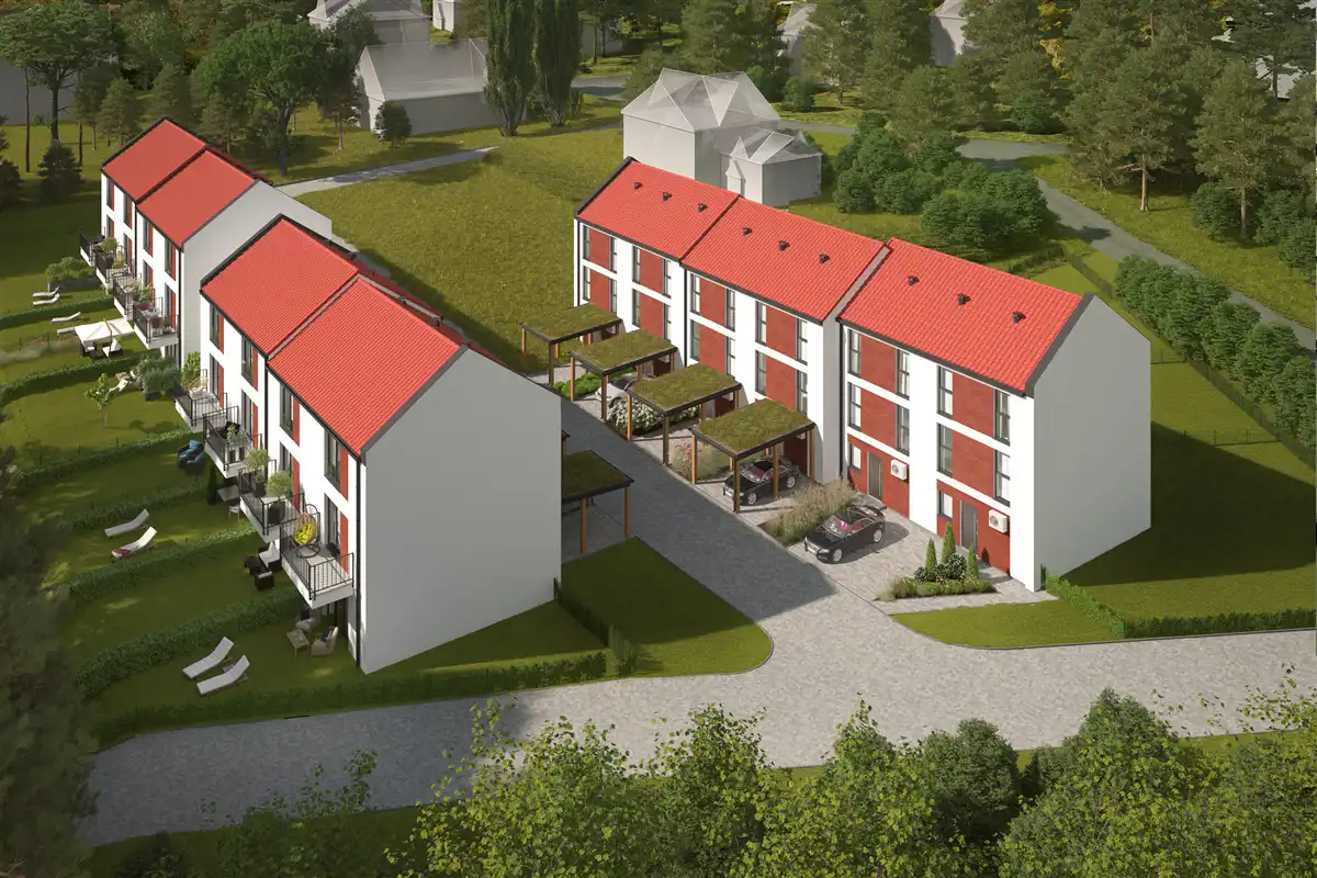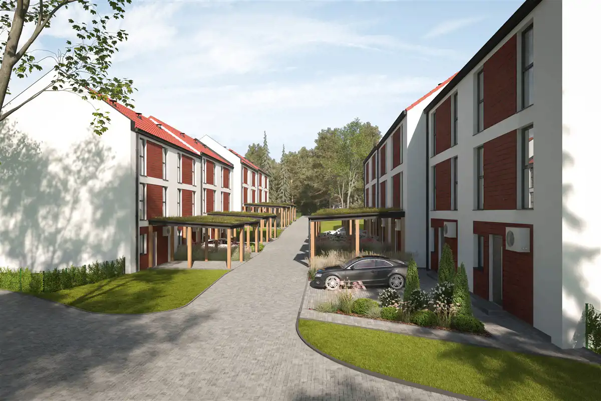 Nowe ogrodzone osiedle domów jednorodzinnych dwulokalowych z podziałem pionowym, urządzone w taki sposób, że każde mieszkanie funkcjonalnie jest jak trzykondygnacyjny dom w zabudowie szeregowej.