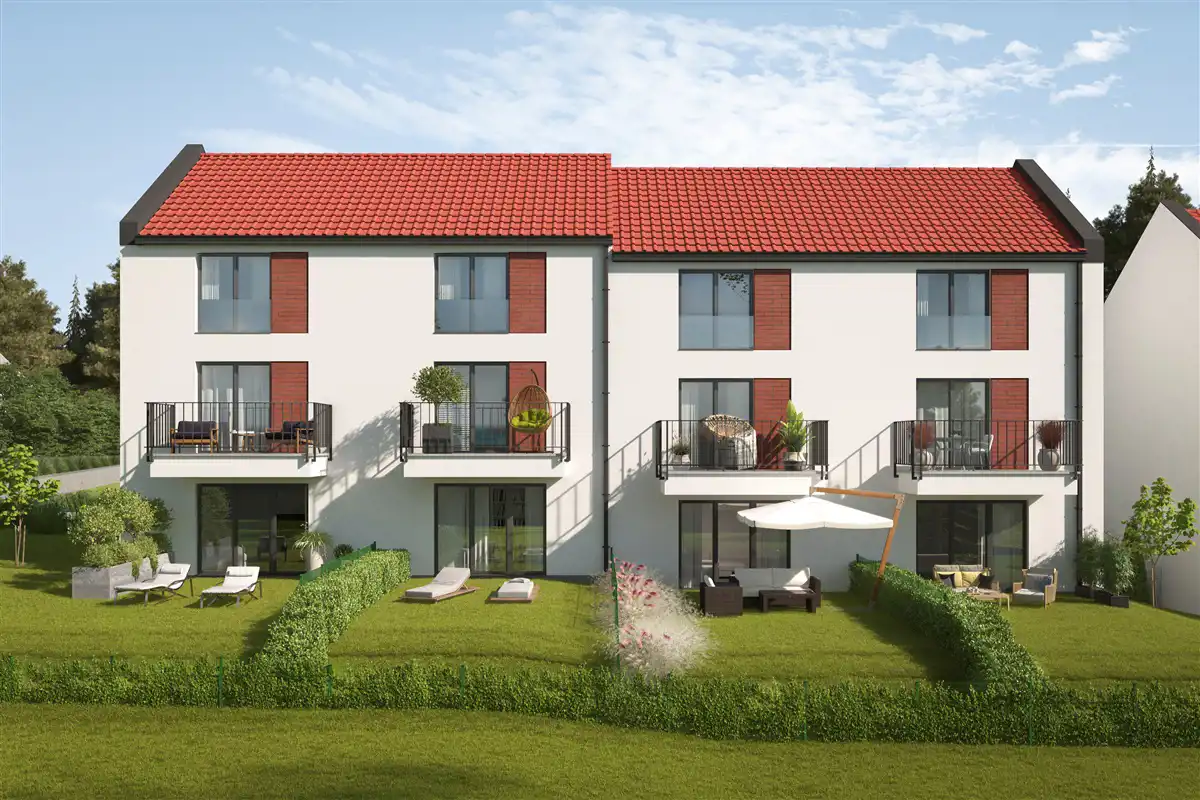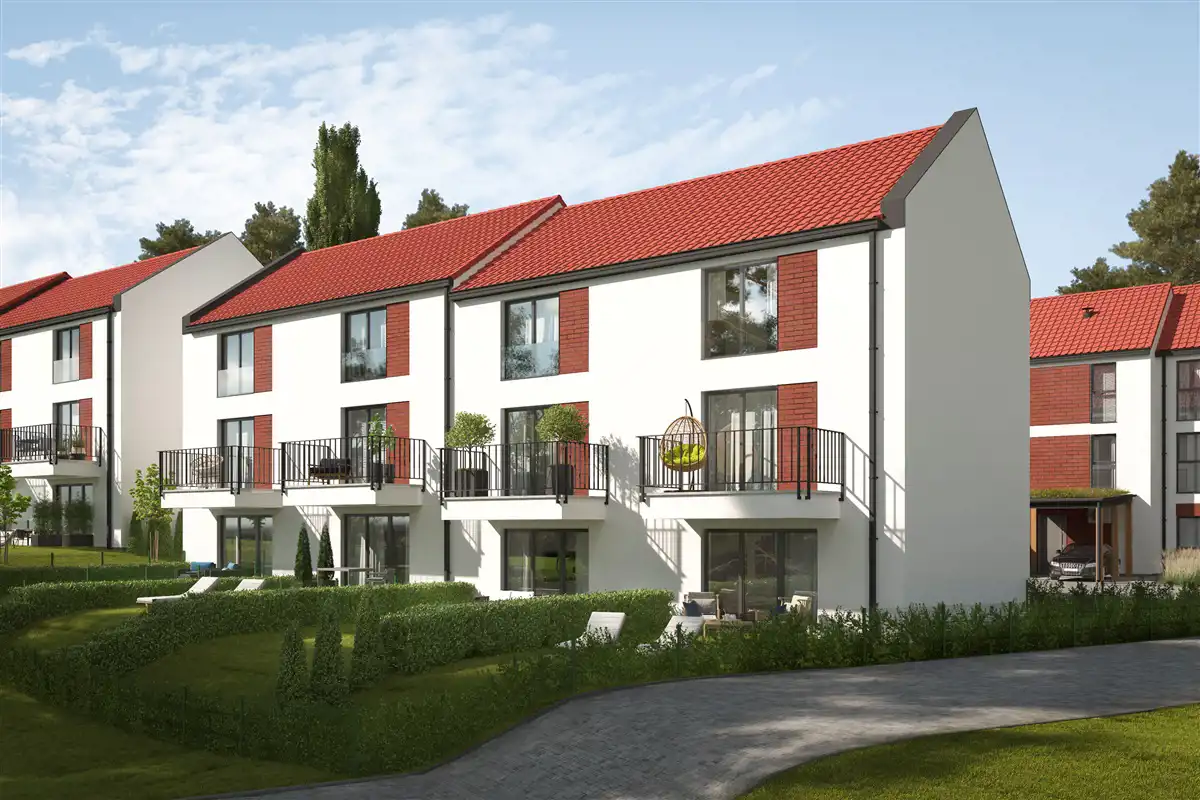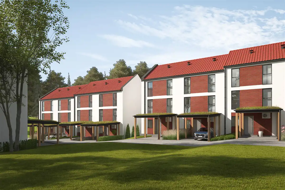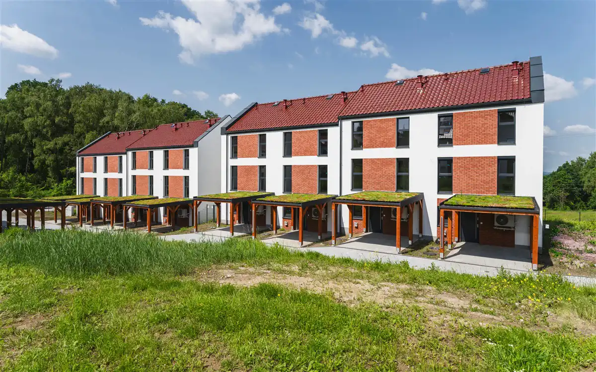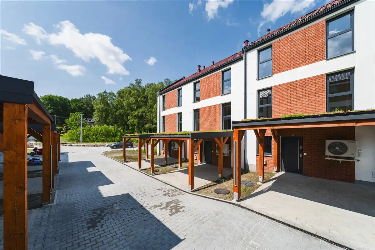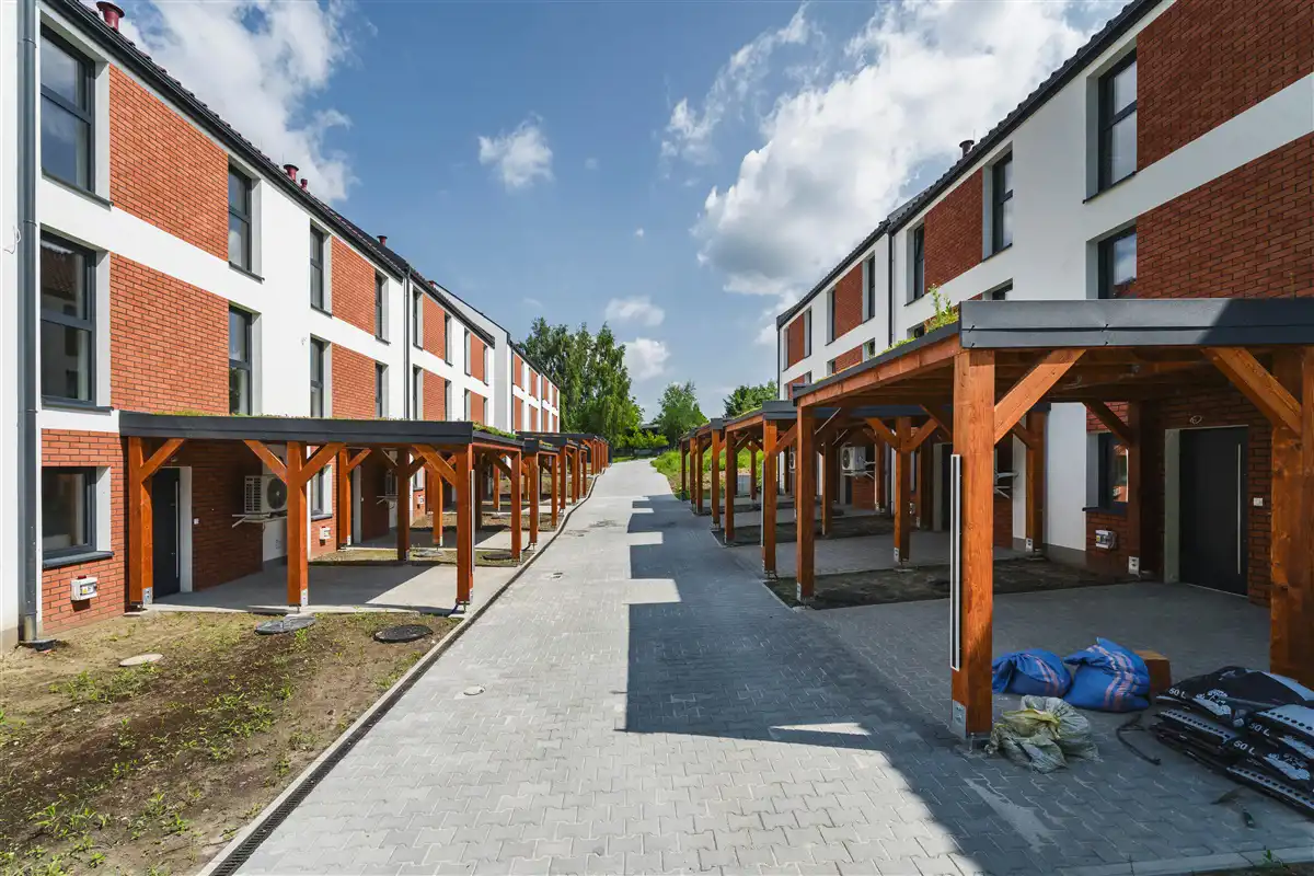 Nowe ogrodzone osiedle domów jednorodzinnych dwulokalowych z podziałem pionowym, urządzone w taki sposób, że każde mieszkanie funkcjonalnie jest jak trzykondygnacyjny dom w zabudowie szeregowej.