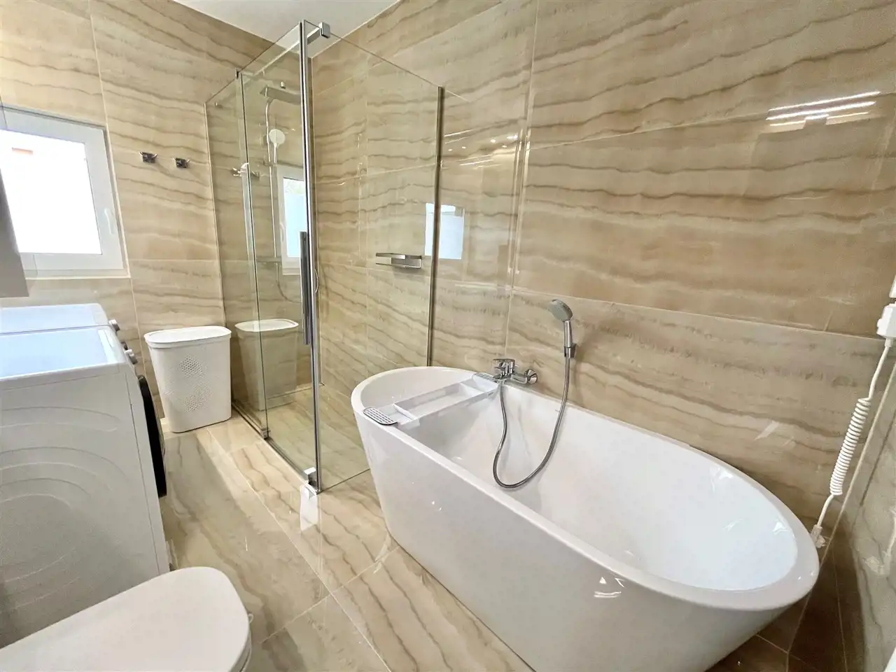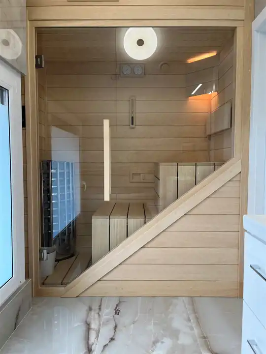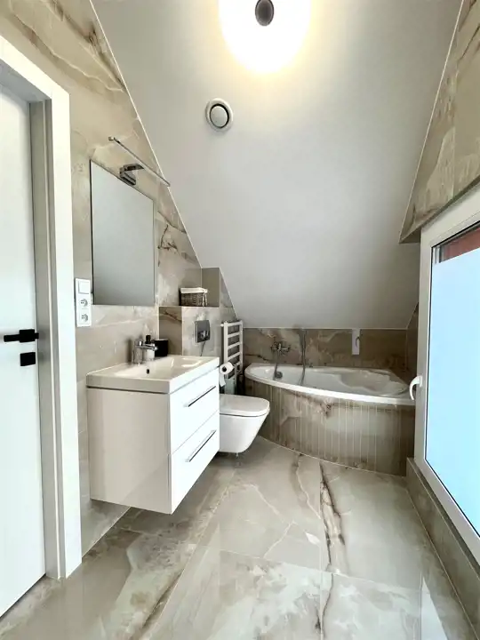 - trzy łazienki (w tym jedna z wydzieloną strefą relaksu SPA, wyposażoną w saunę i jacuzzi),