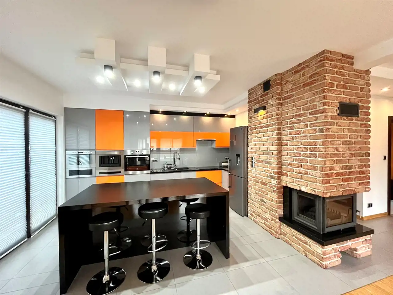 — a modern kitchen with an island (induction hob, oven, microwave, built-in coffee machine, dishwasher, refrigerator),