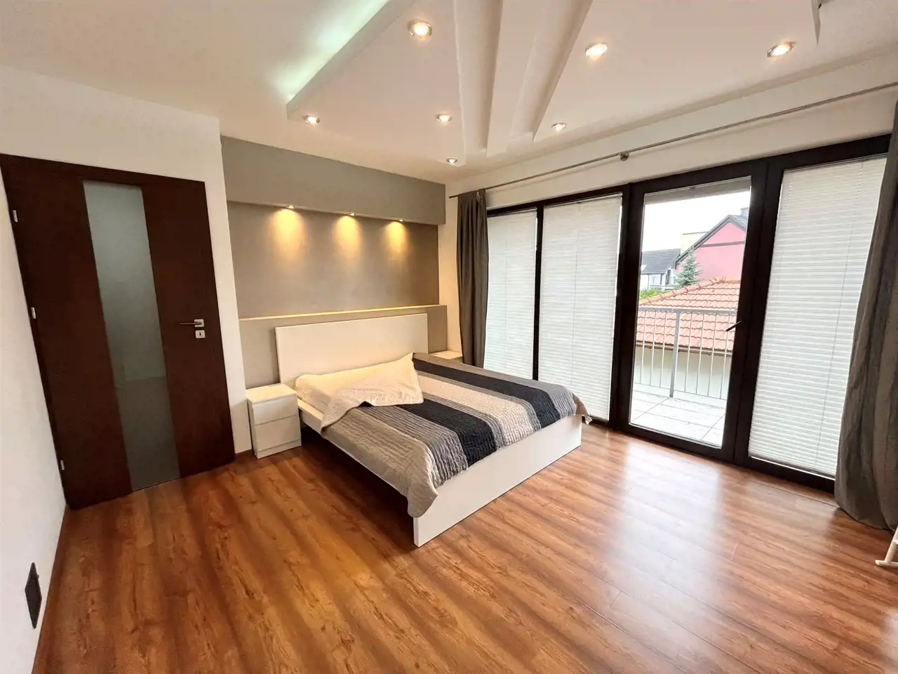 — sypialnia główna z łóżkiem dwuosobowym, garderobą i wyjściem na balkon,
