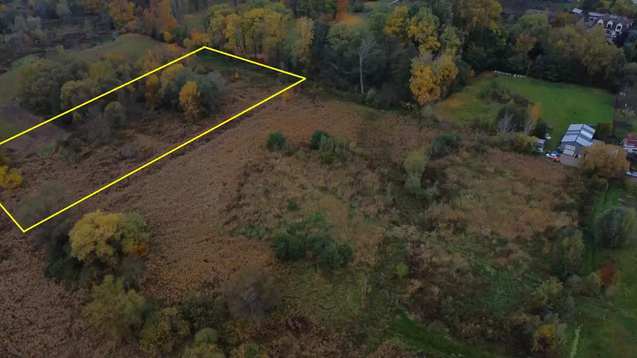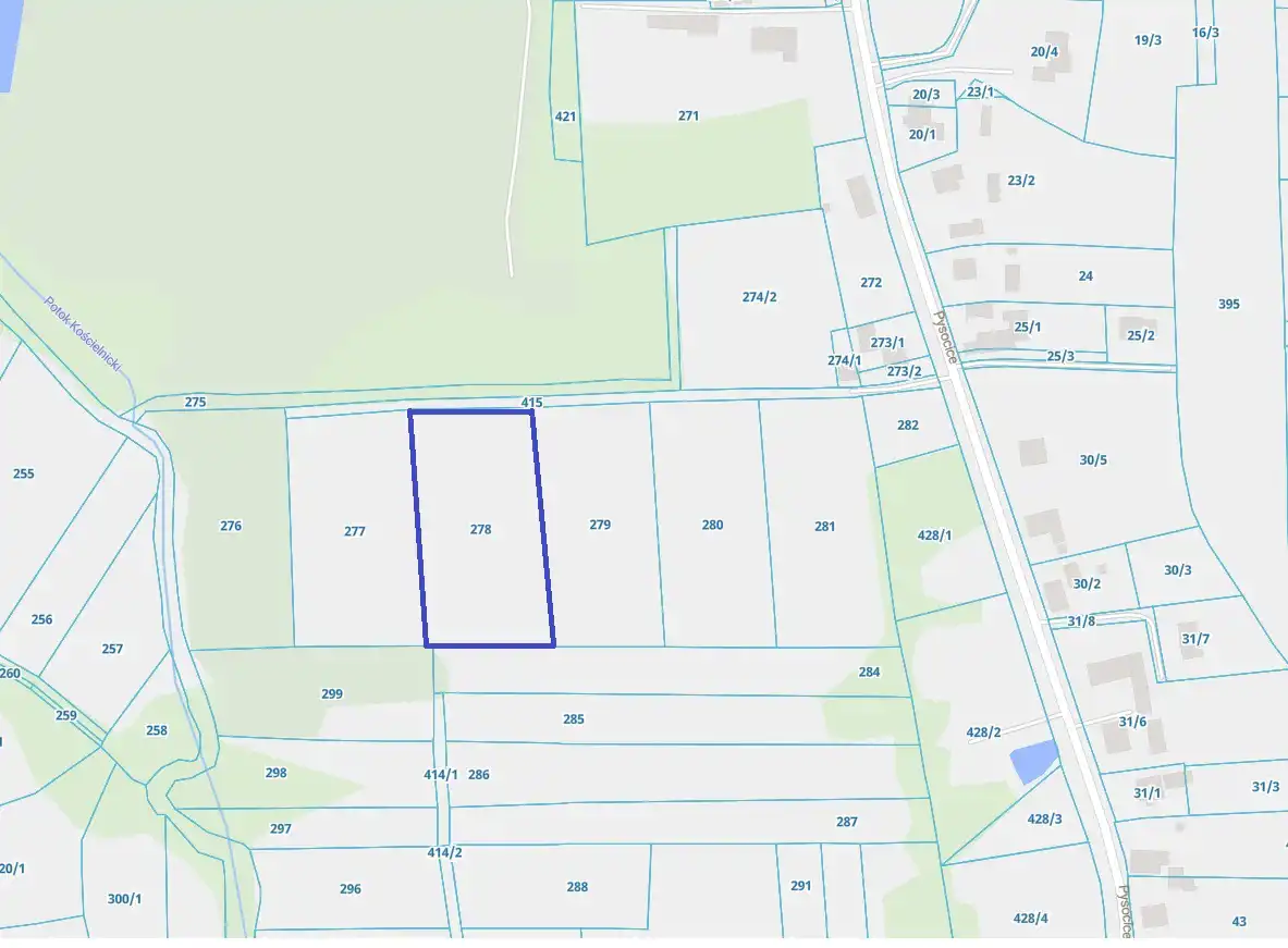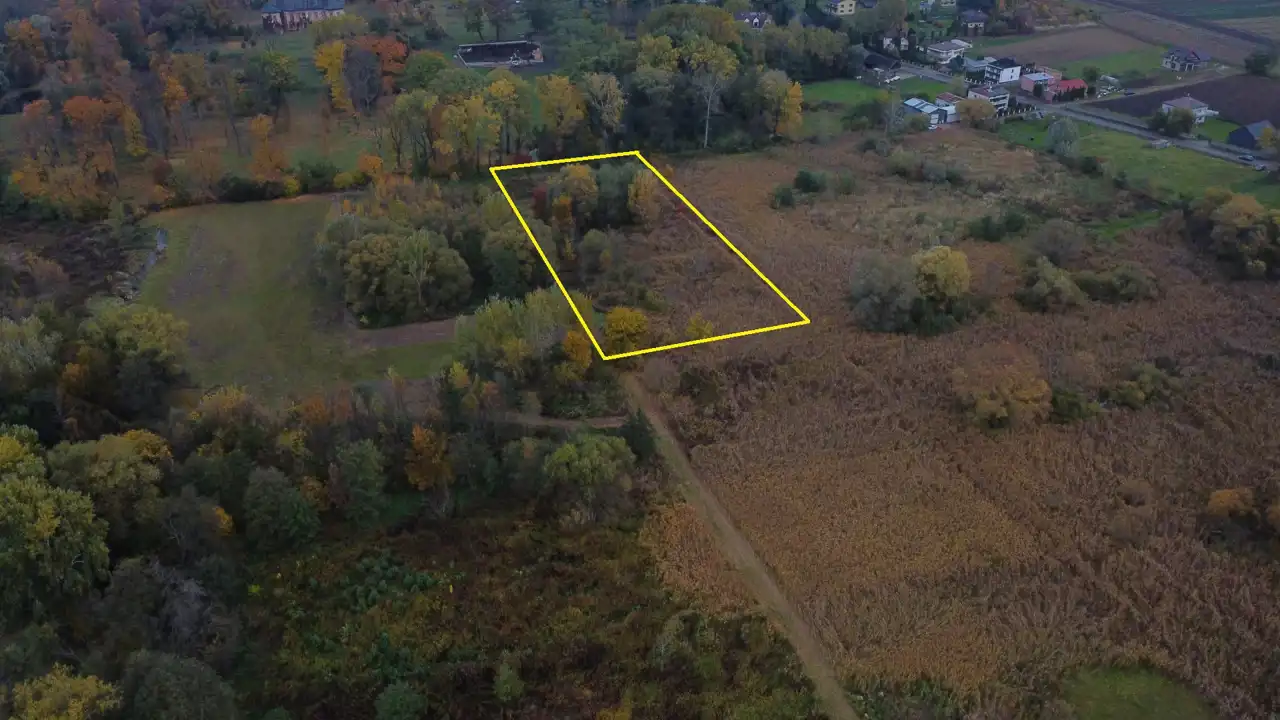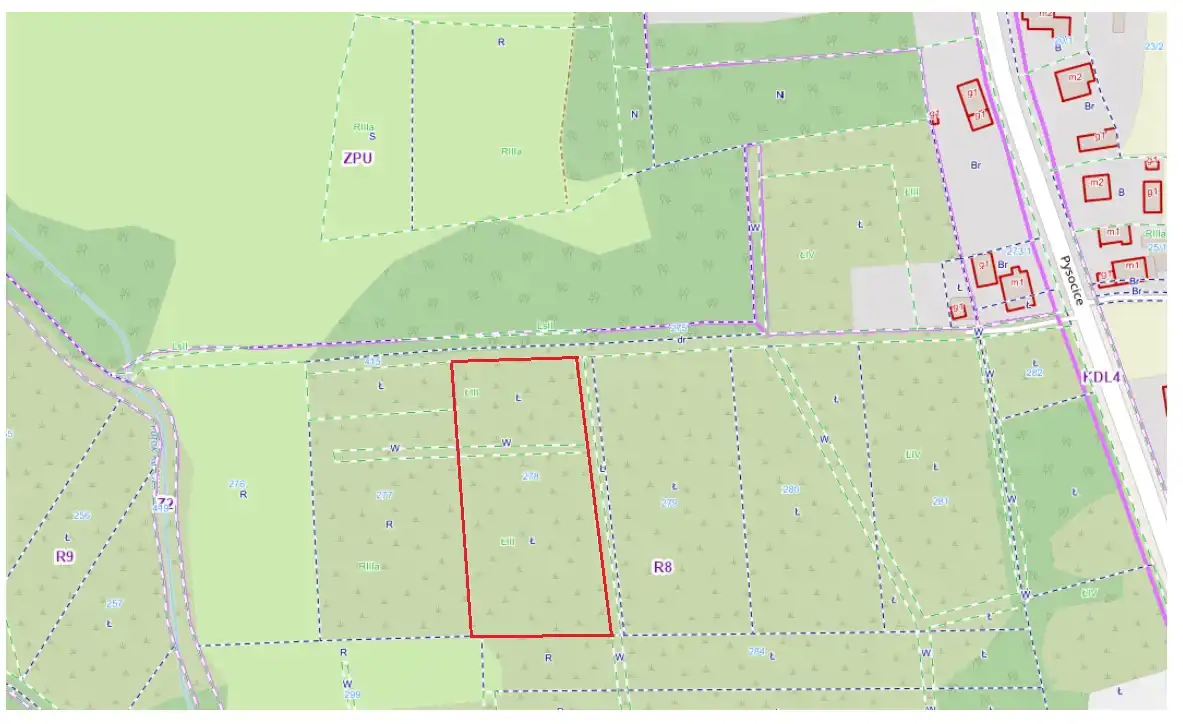 Działka ma kształt prostokąta o wymiarach około 50 m x 100 m, miejscami zadrzewiona.