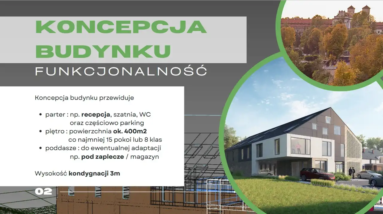Posiadamy koncepcję budynku 2-3 kondygnacyjny o powierzchni użytkowej na piętrze około 400m2: