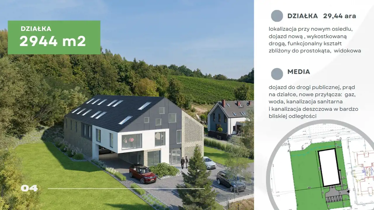 - parking : na działce, ewentualnie dodatkowo na parterze budynku.
