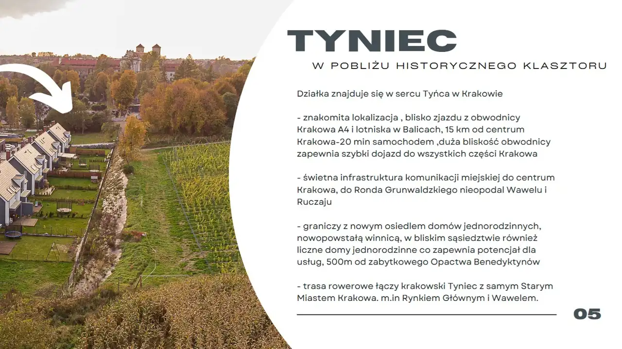 Lokalizacja: w okolicy dosyć gęsta zabudowa mieszkaniowa, nowe osiedle domów w zabudowie wolnostojącej i bliźniaczej, blisko przystanek autobusowy, wyjazd na obwodnicę A4, dojazd do centrum Krakowa zajmuje około 20 minut. Atrakcje turystyczne: Klasztor Benedyktynów, Tyniecki Park Krajobrazowy, Przystań Tyniecka oferująca możliwość wypożyczenia łodzi, kajaków lub rowerów wodnych, trasa rowerowa łączy krakowski Tyniec z samym Starym