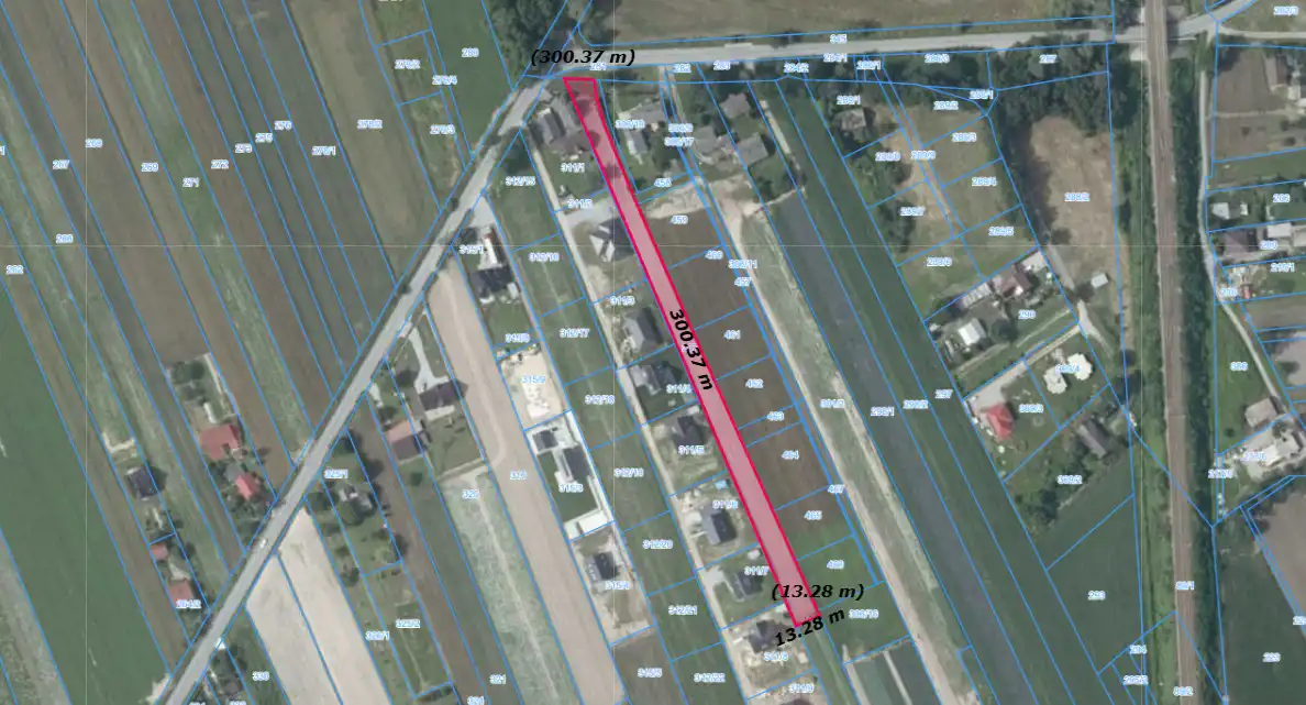 Działka o powierzchni 3390 m2 i wymiarach śr. 10x302 m. Działka niezabudowana, płaska, niezadrzewiona.