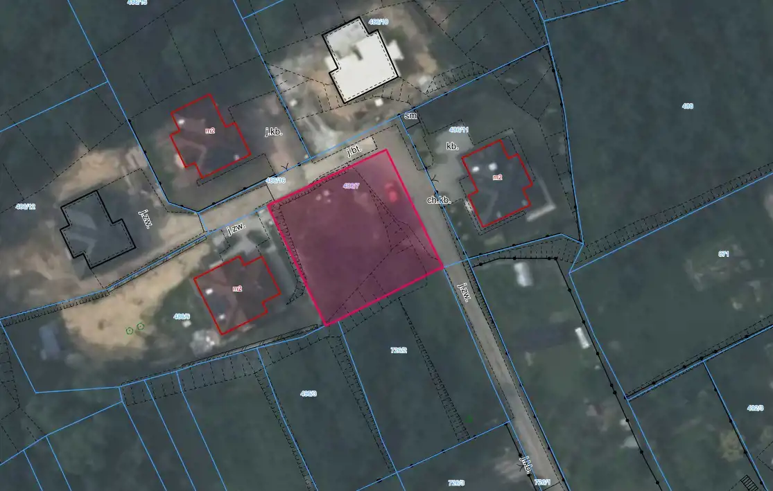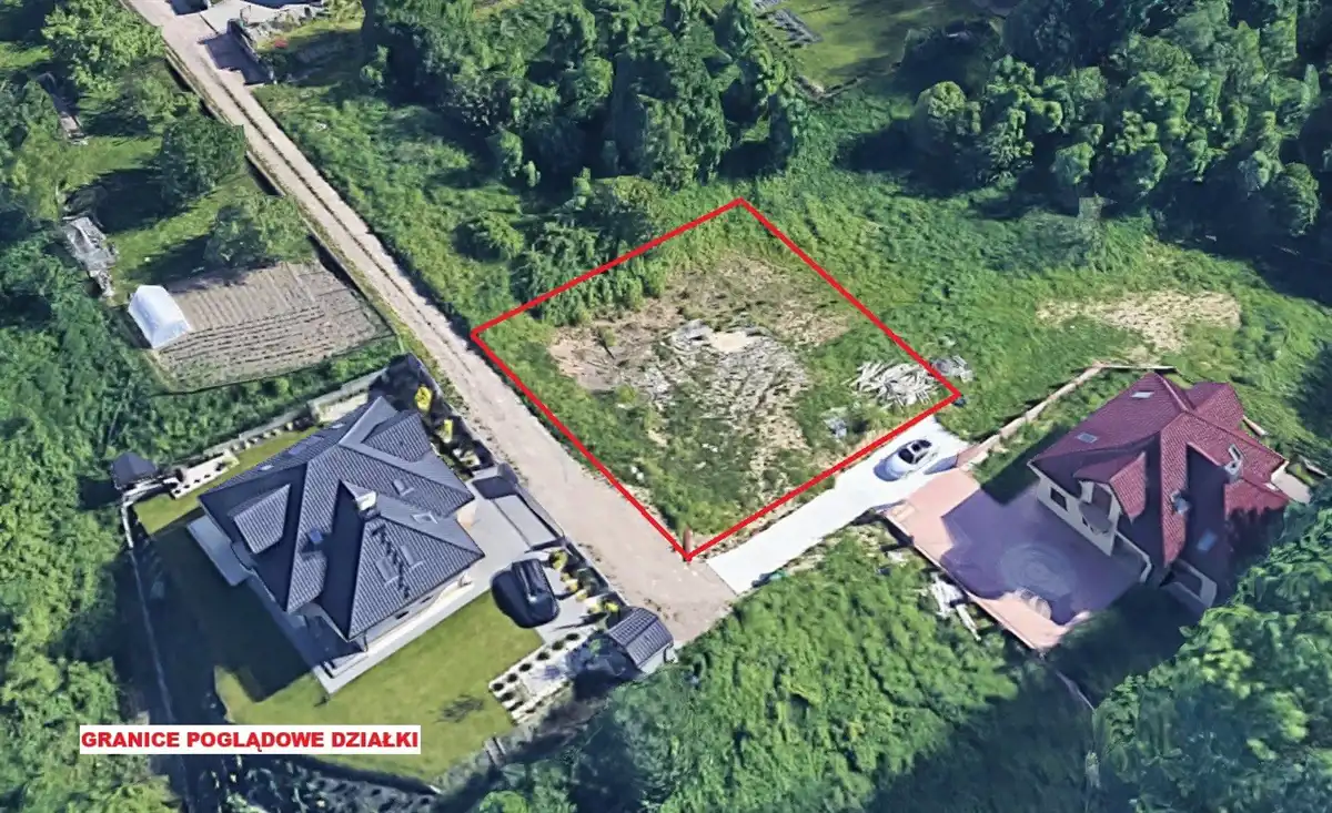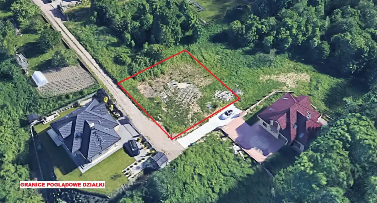 Działka w kształcie kwadratu, o wymiarach ok. 25 x 25 m, w sąsiedztwie nowej zabudowy jednorodzinnej i lasu.