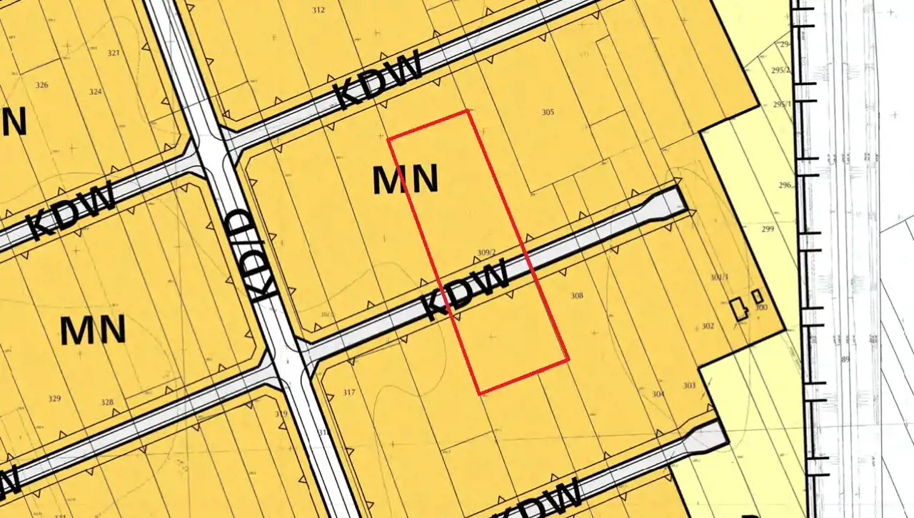 Zgodnie z MPZP działka leży w terenie zabudowy mieszkaniowej jednorodzinnej, oznaczonym w planie symbolem MN. Teren budowlany przedzielony jest pasem pod drogi wewnętrzne KDW o pow. 398 m2