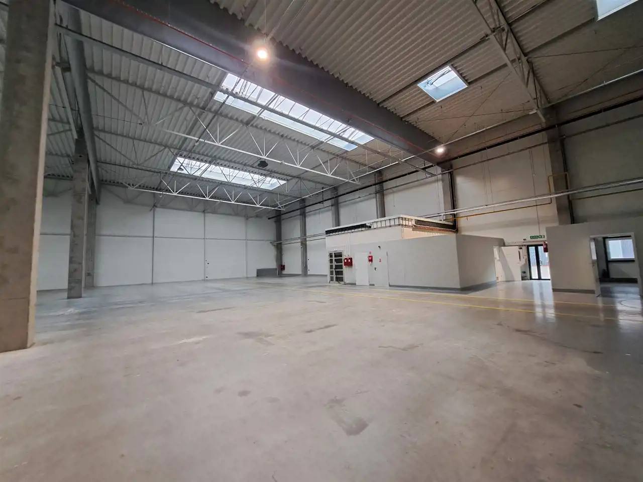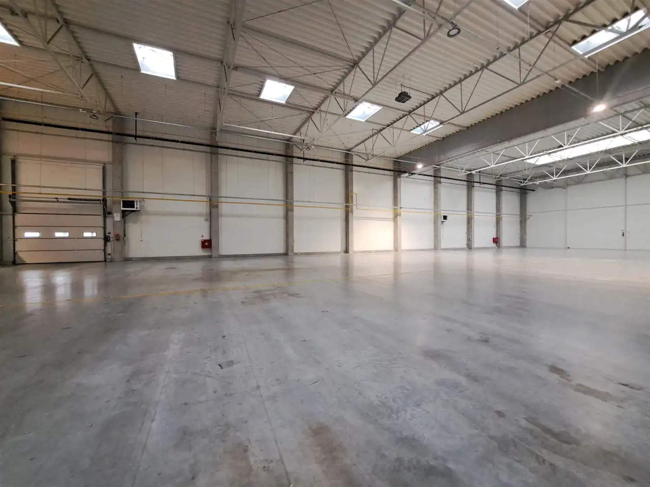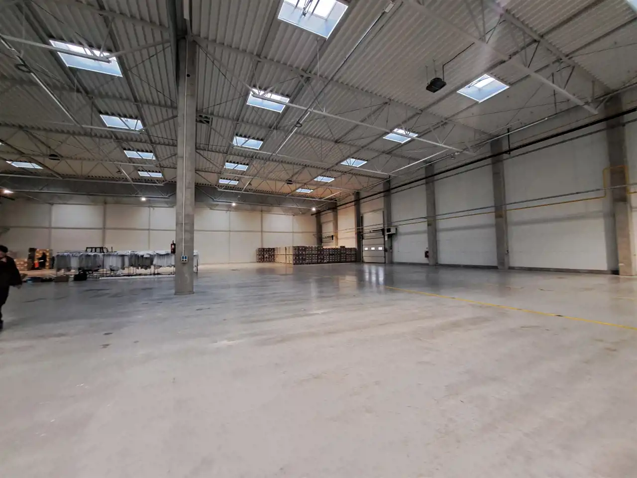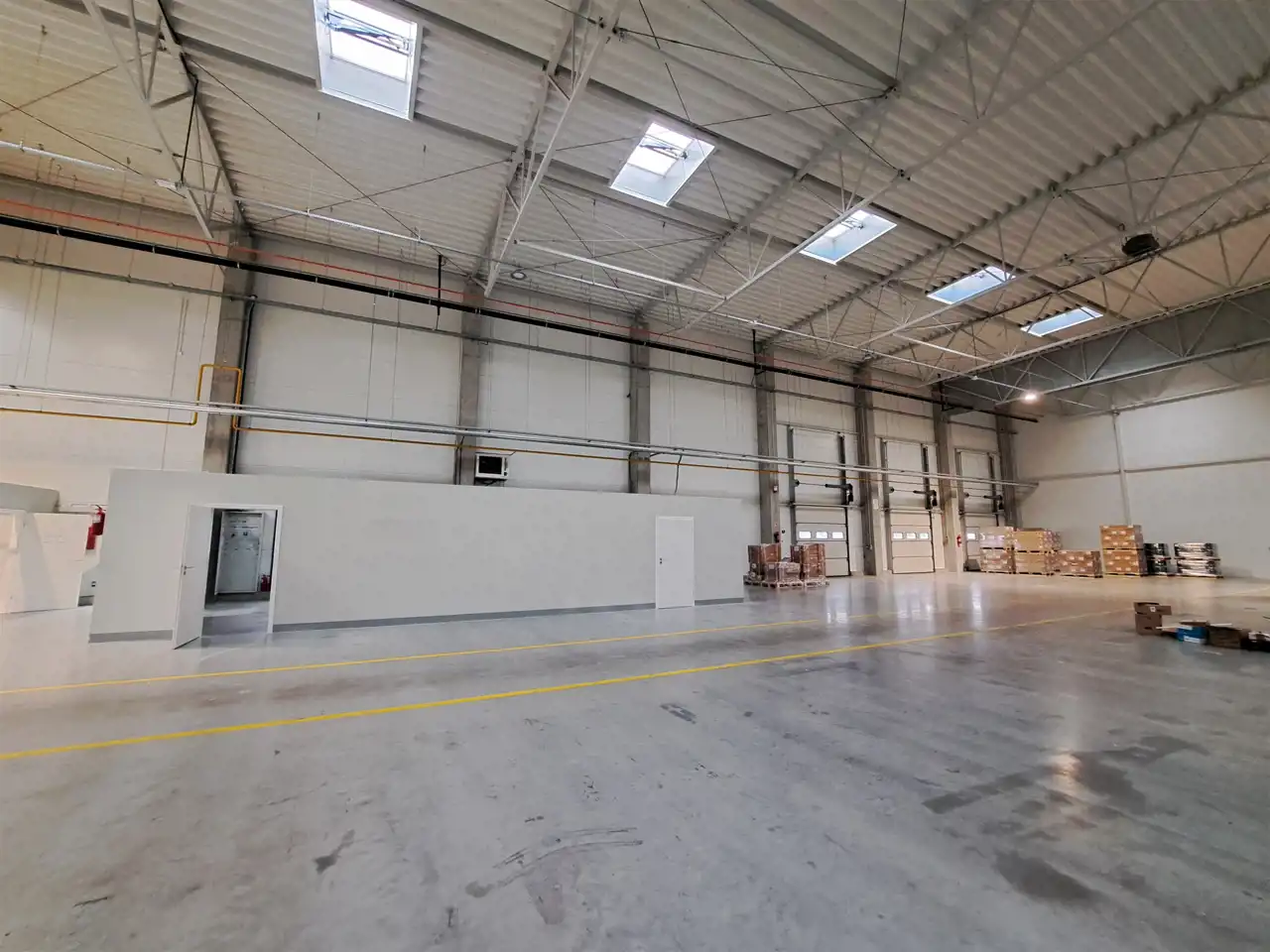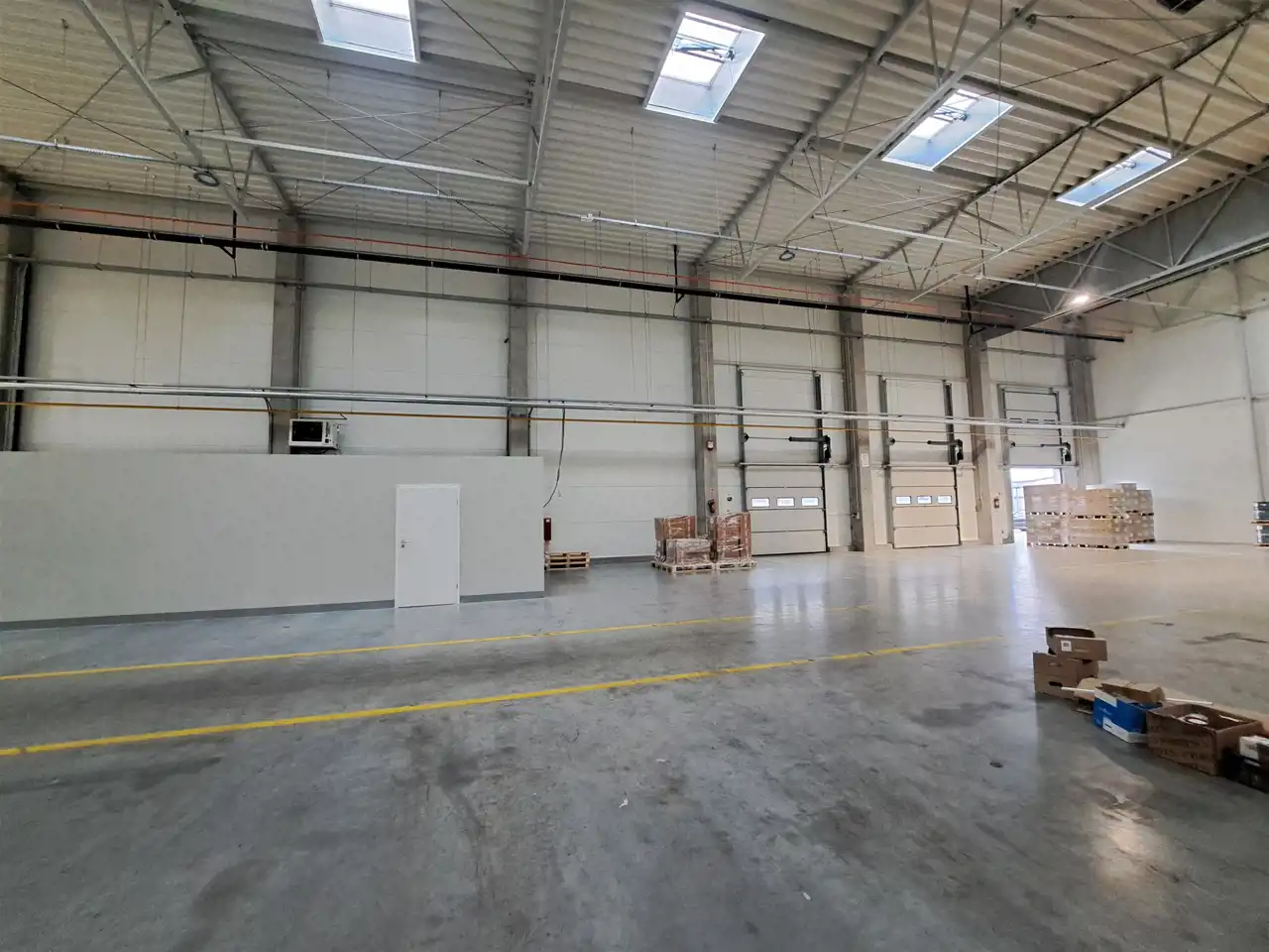 - Wysokość hali: 7,5m co pozwala na składowanie wysokiego asortymentu lub instalację regałów magazynowych.