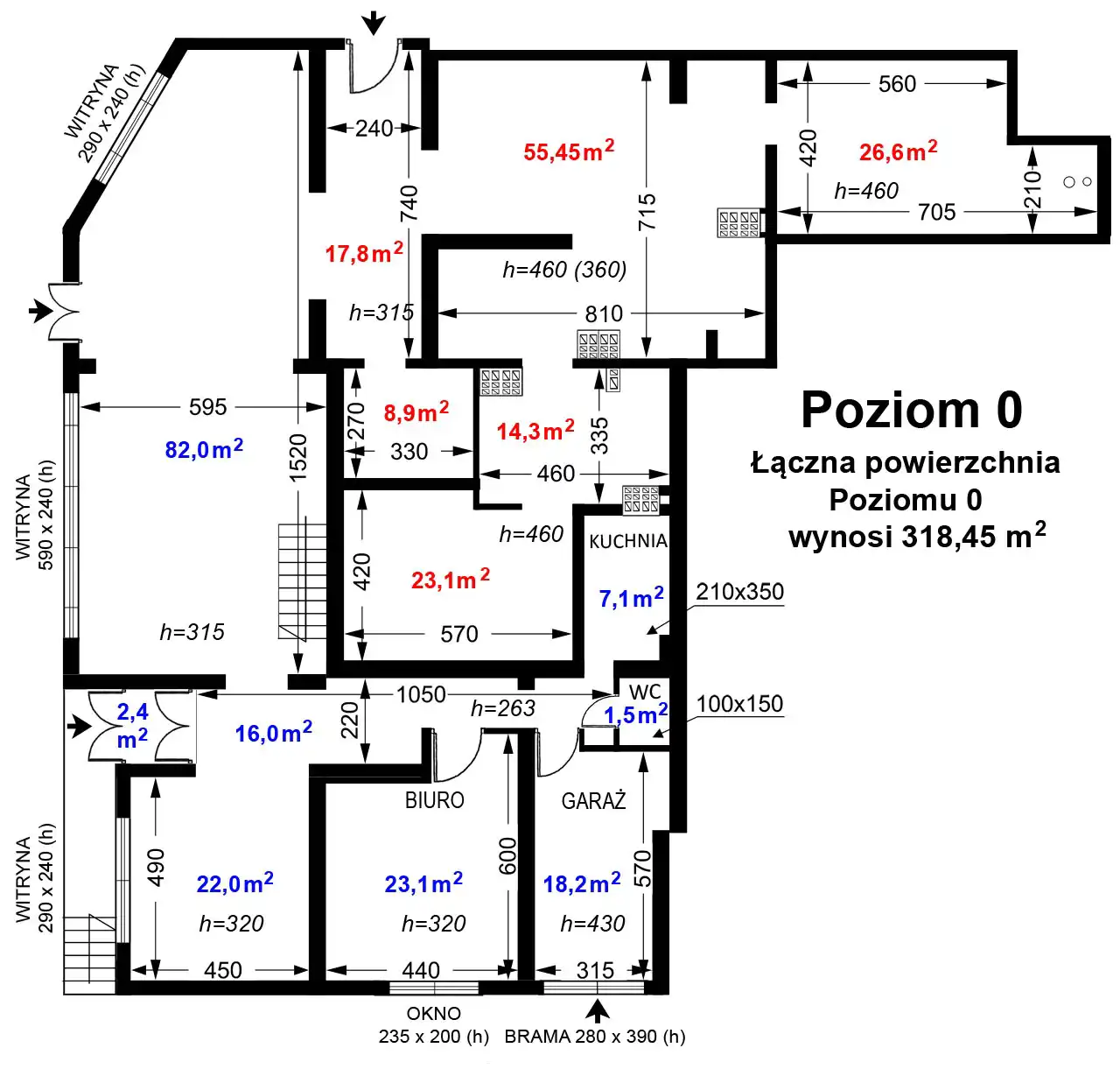 Lokal będący przedmiotem oferty składa sie z dwóch poziomów: parteru 318,85 m2 z rampą oraz piwnicy 104,40m2.