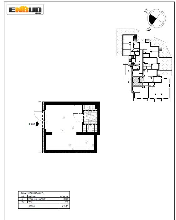 -powierzchnia 24,84m2 ( w tym 20,39m2 pomieszczenie usługowe i 4,45m2 wc)