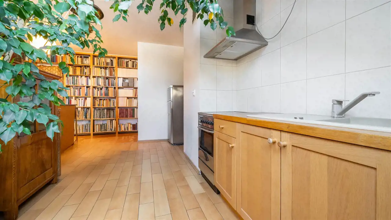 Na podłogach w pokojach i garderobie parkiet, w pozostałych pomieszczeniach płytki.