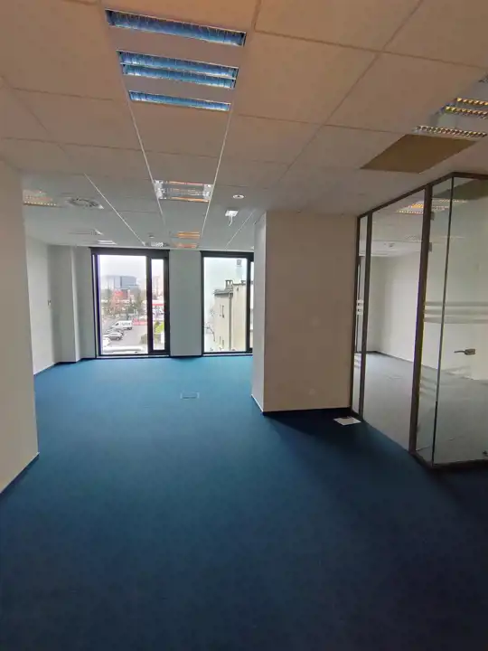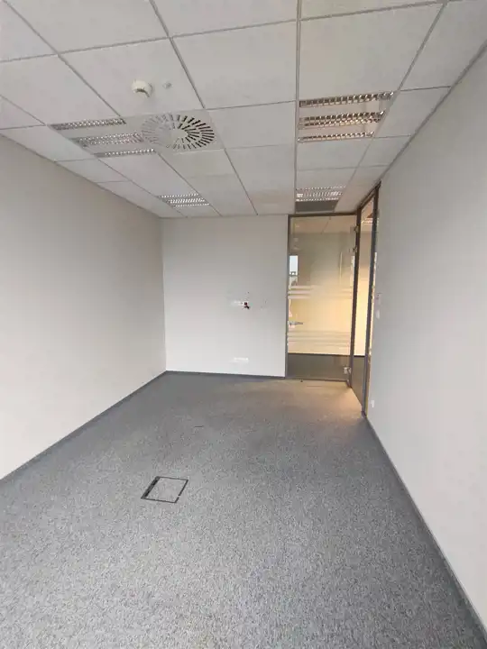 Na podłodze wysokiej jakości wykładzina biurowa, ściany pomalowane na biało.
