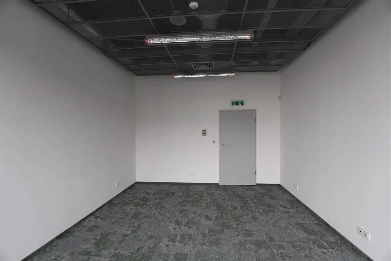Na podłodze jest wysokiej jakości wykładzina biurowa, ściany pomalowane na biało.