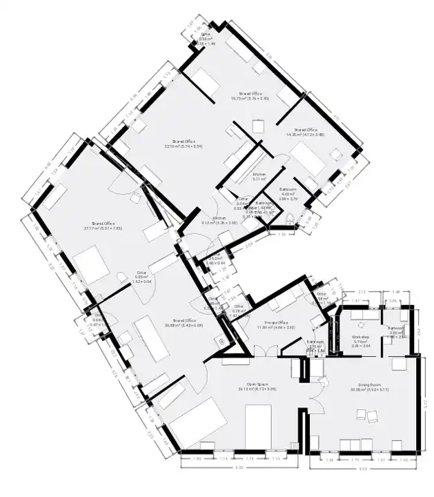 Lokal 234 m2 składa się z pokoju z recepcją, 7 pokoi, 2 łazienek, 2 toalet i 4 balkonów. Ma 3 wejścia z klatki schodowej i wiele możliwości aranżacyjnych.