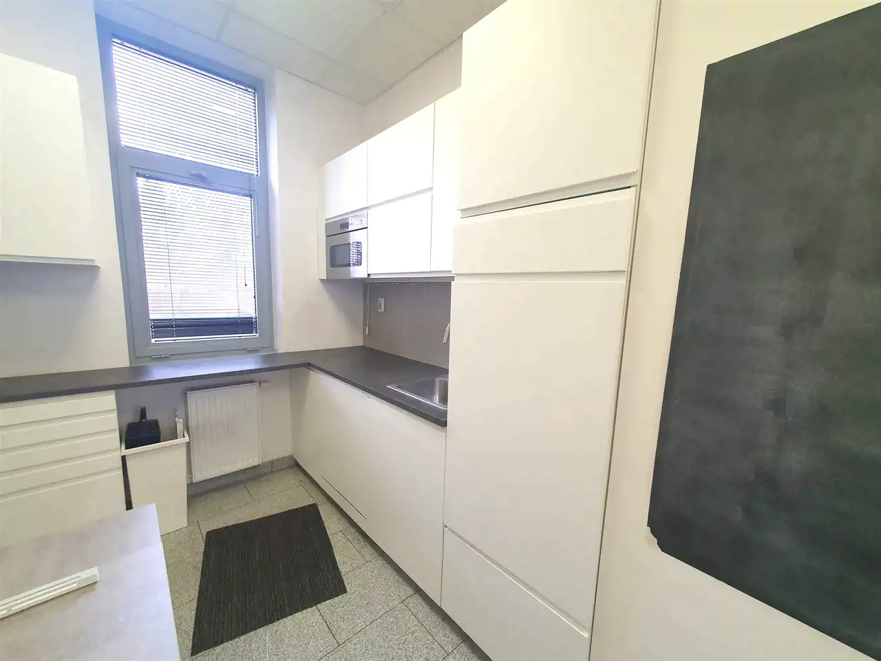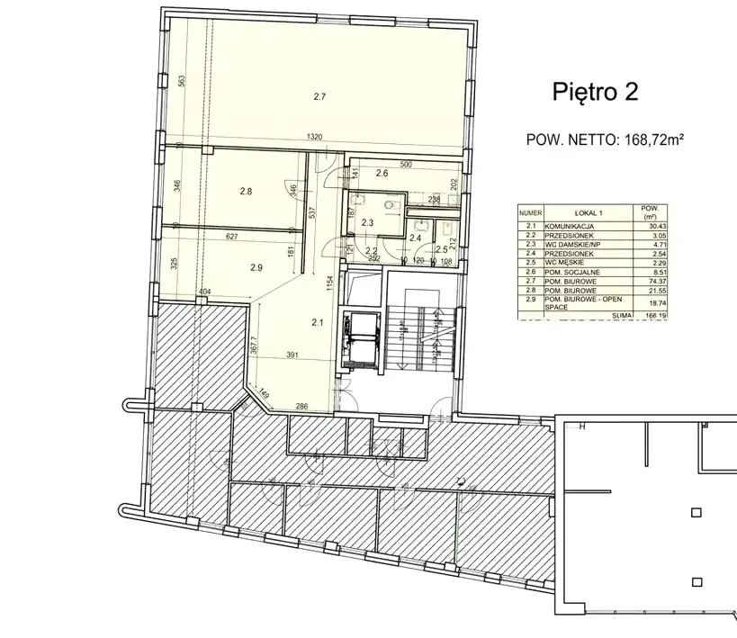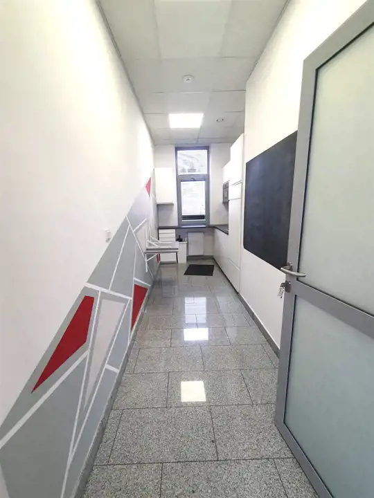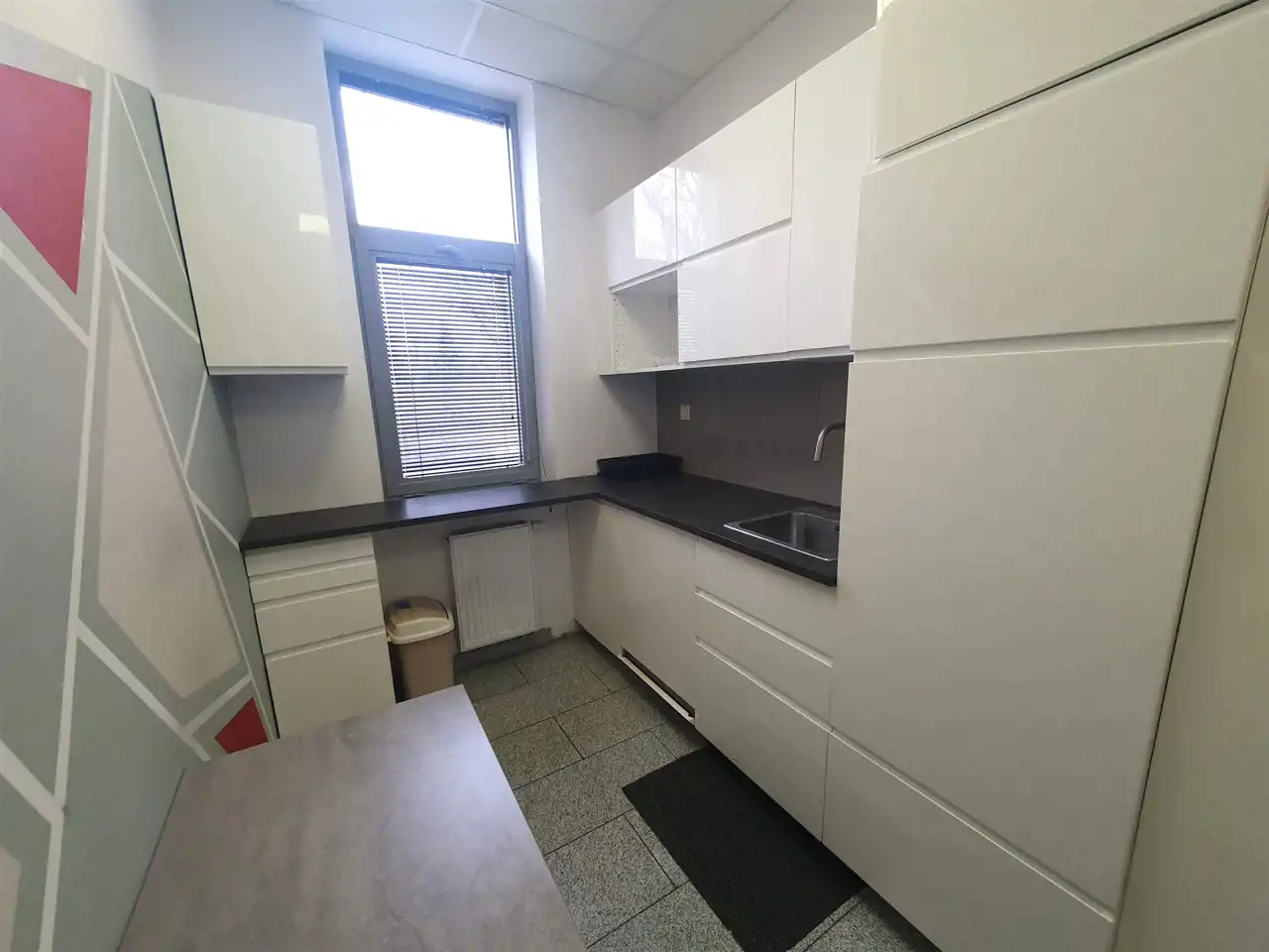 Lokal o powierzchni ponad 168 m2 składa się z pomieszczeń biurowych, kuchni z jadalnią, korytarza i toalet.