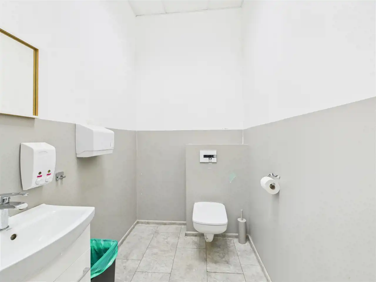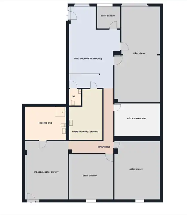Aktualnie lokal składa się z: przestronnego hollu (z miejscem na recepcję) połączonego z komunikacją, 5 pokoi biurowych, pomieszczenia magazynowego/pokoju biurowego, aneksu kuchennego z jadalnią, wc, bardzo dużej łazienki z wc.