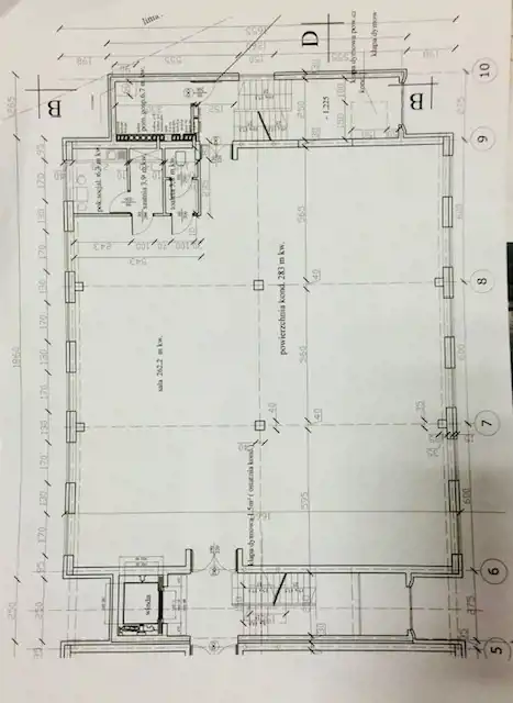 -powierzchnia całkowita 283 m2 ( w tym 262,2 sala, 3,8m2 wc, 3,9m2 pomieszczenie socjalne, 6,3m2 kuchnia, 6,7m2 pomieszczenie techniczne)
