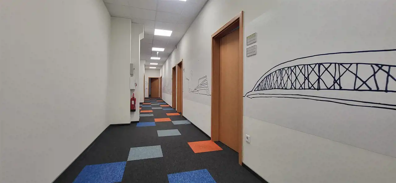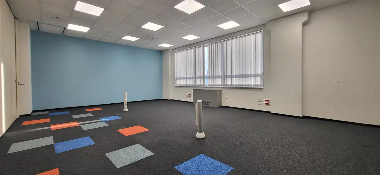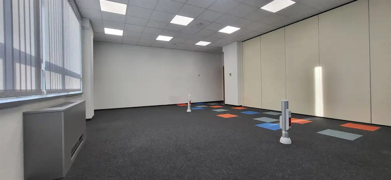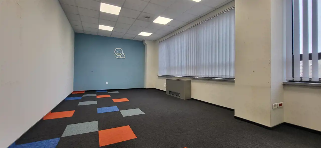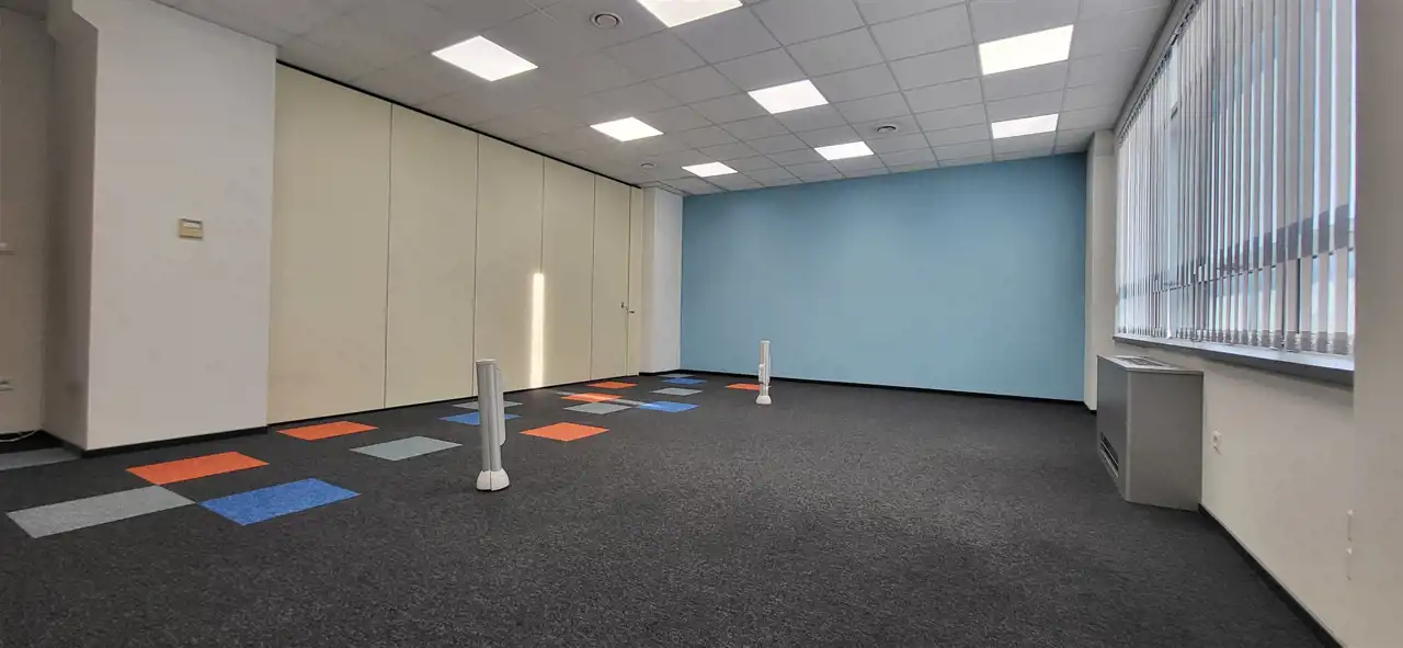 - 7 oddzielnych pokoi biurowych, w tym jeden największy pokój ma możliwość przedzielenia ścianką mobilną i uzyskania dodatkowej sali konferencyjnej.
