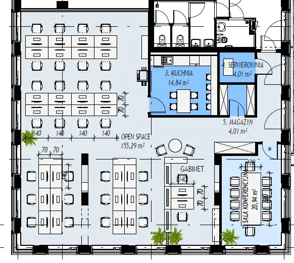 Lokal składa się z: komunikacji, gabinetu, powierzchni open space, aneksu kuchennego, pomieszczenia magazynowego, serwerowni.