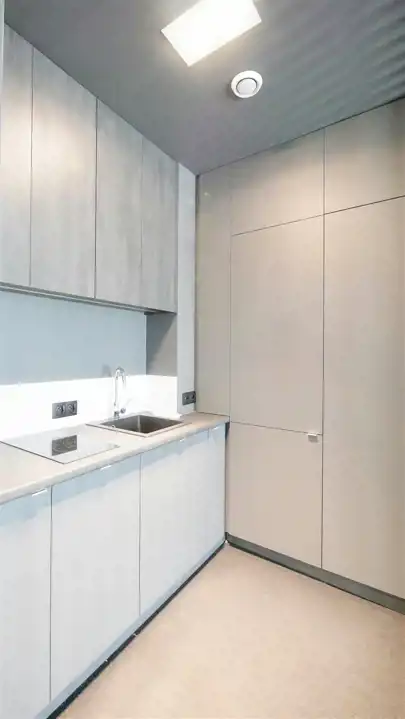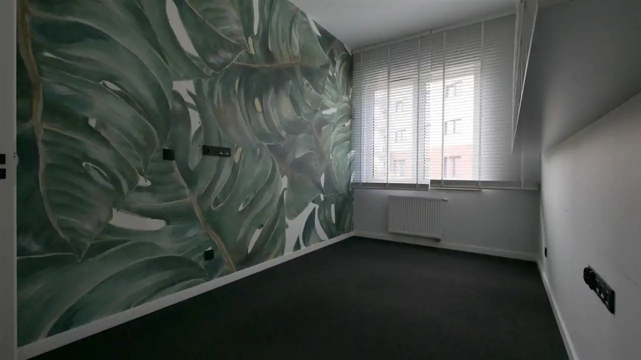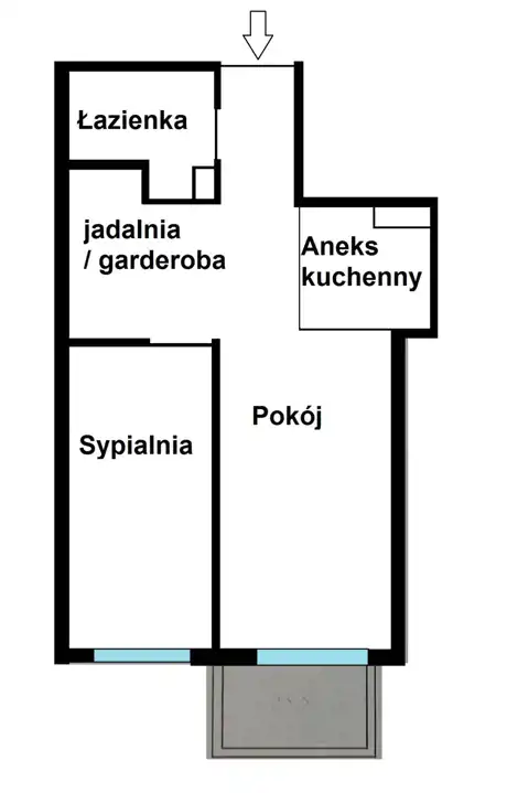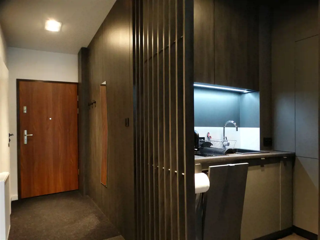 Lokal składa się z salonu z aneksem kuchennym i jadalnią, pokoju, łazienki oraz przedpokoju. Aneks kuchenny zabudowany meblami na wymiar w ciemnej tonacji, oddzielony od salonu ażurową ścianą. Łazienka z prysznicem, w szafie w zabudowie jest miejsce na pralkę. Lokal wymaga odświeżenia/malowania - możliwa aranżacja we własnym zakresie, ewentualna karencja w płatności czynszu.