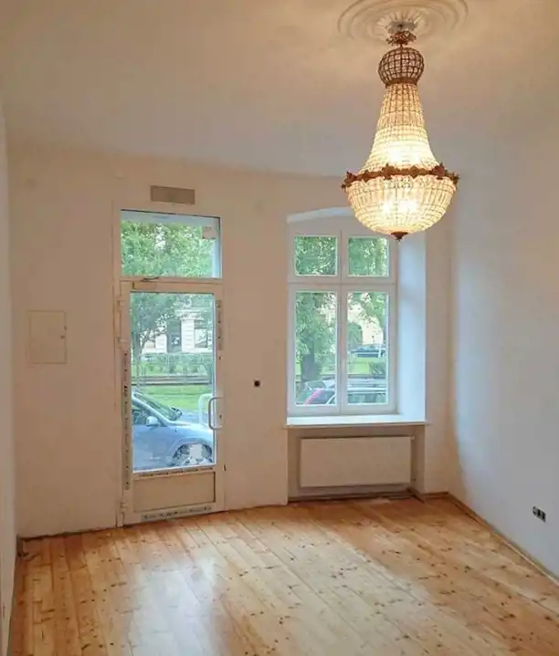 Lokal frontowy, z witryną na parterze kamienicy o powierzchni 49 m2 składa się z 2 sal sprzedaży, biura/magazynu oraz toalety.