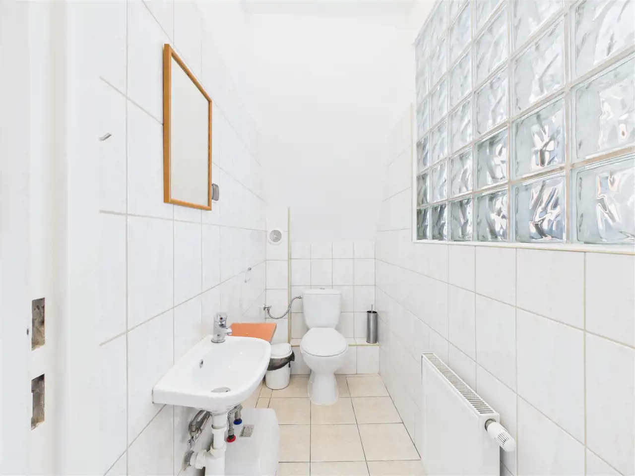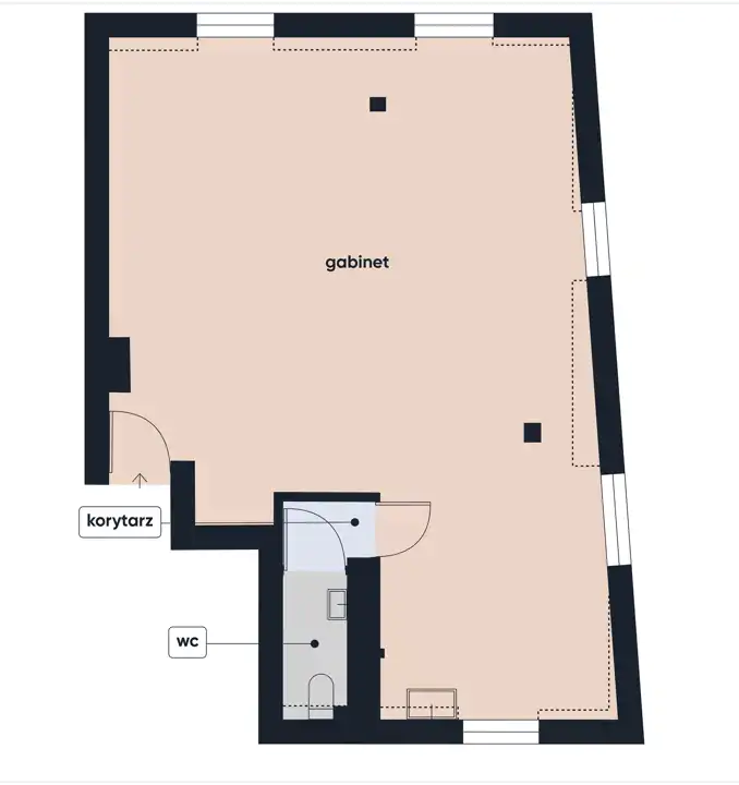 Lokal składa się z: jednego przestronnego pokoju biurowego z wydzielonym aneksem kuchennym, korytarza oraz wc.