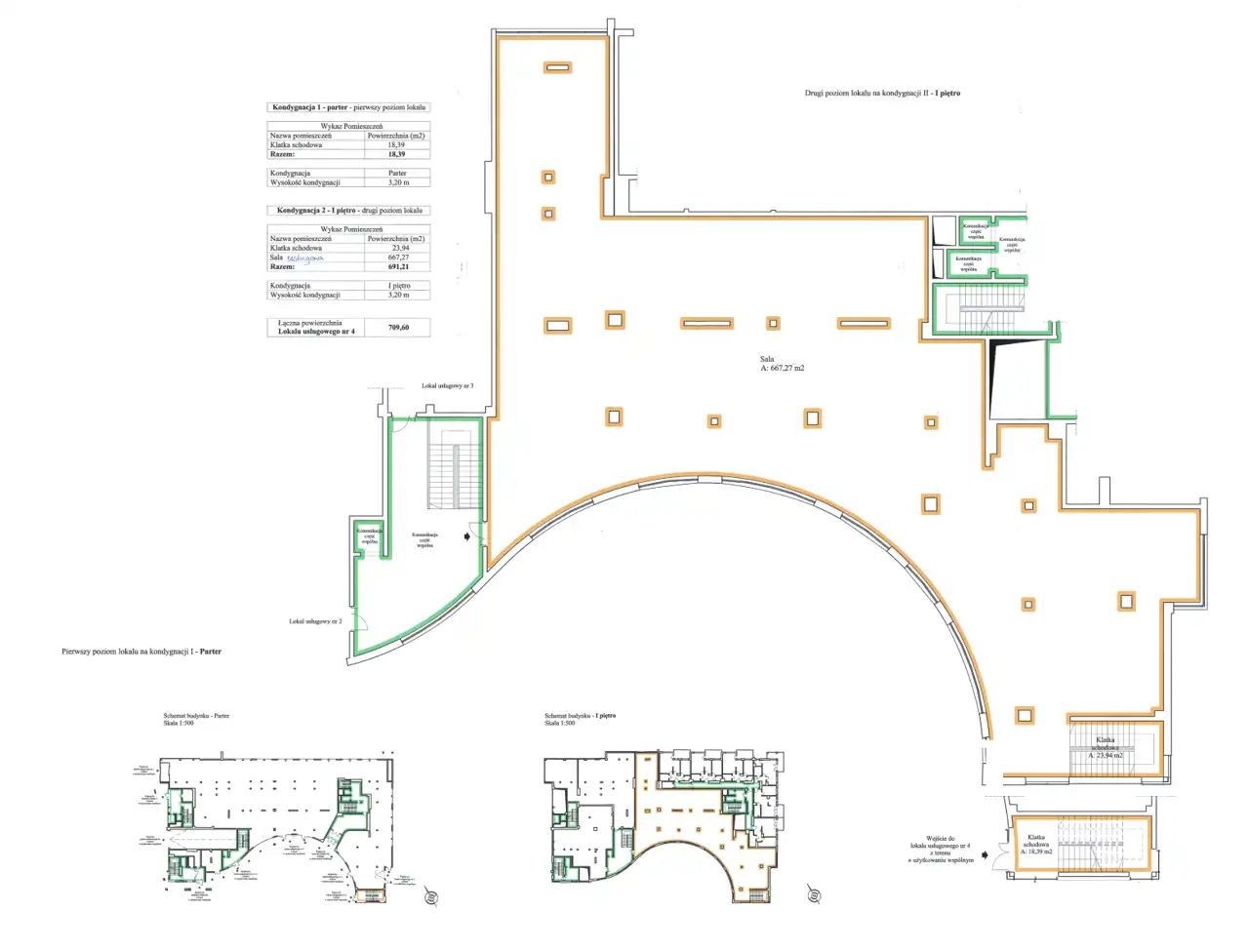Powierzchnia użytkowa 667 m2, pozostałe 43 m2 to własna klatka schodowa.