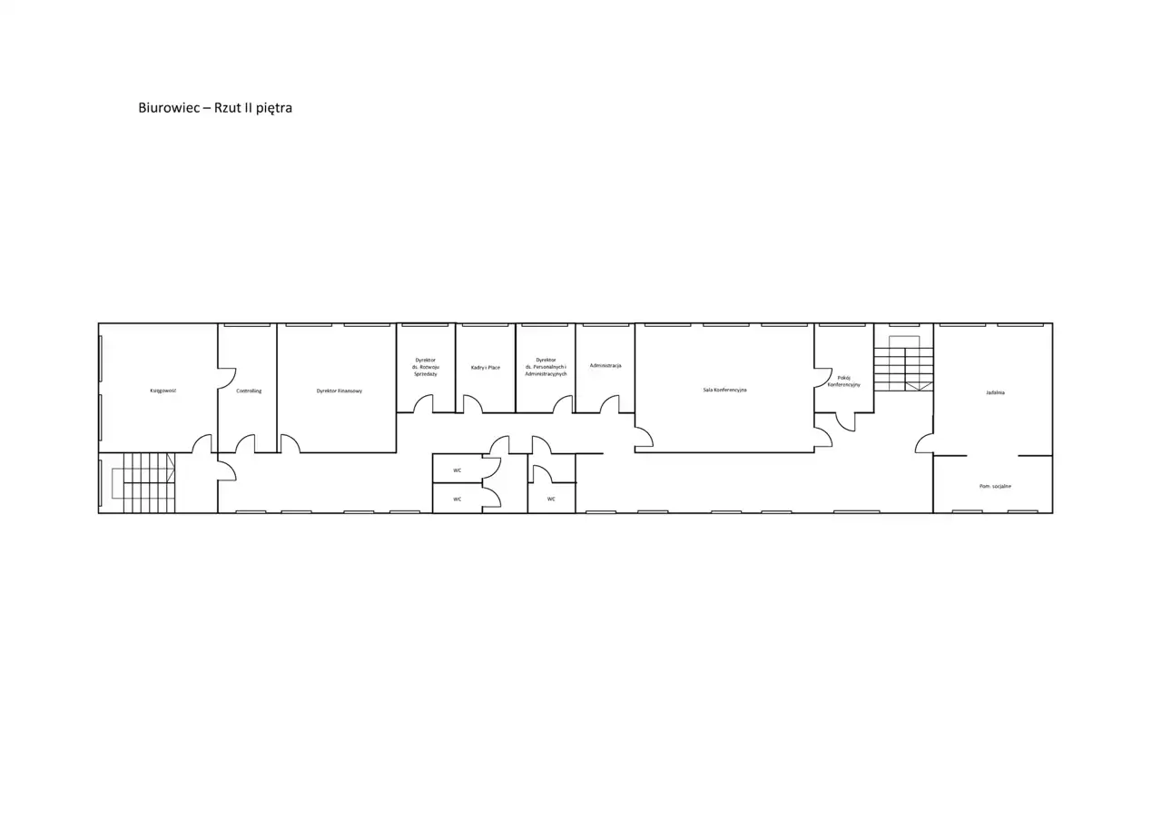 Powierzchnia na I i II piętrze to typowa przestrzeń biurowa podzielona na kilkanaście pokoi w układzie gabinetowym, sale konferencyjne, część socjalną - kuchnię praz toalety.