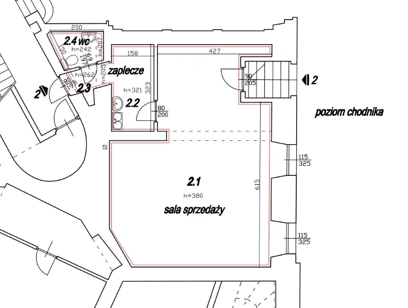 Lokal frontowy, z dużymi witrynami na parterze kamienicy o powierzchni 52 m2 składa się z sali sprzedaży, biura/magazynu oraz toalety.