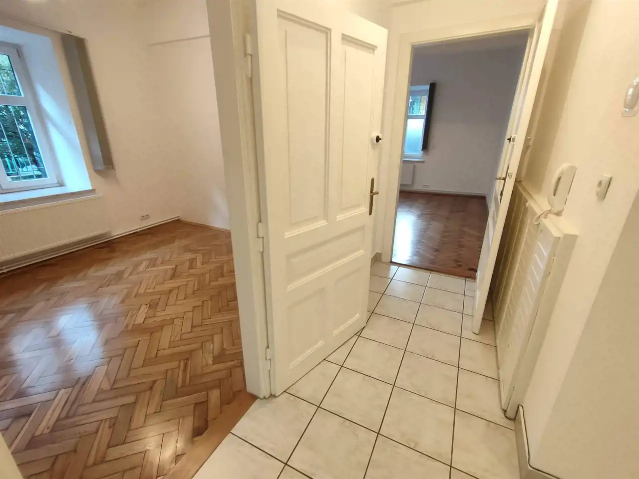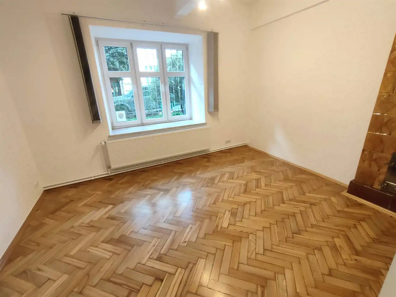 * Dwa pomieszczenia z parkietem i ozdobnym piecem kaflowym