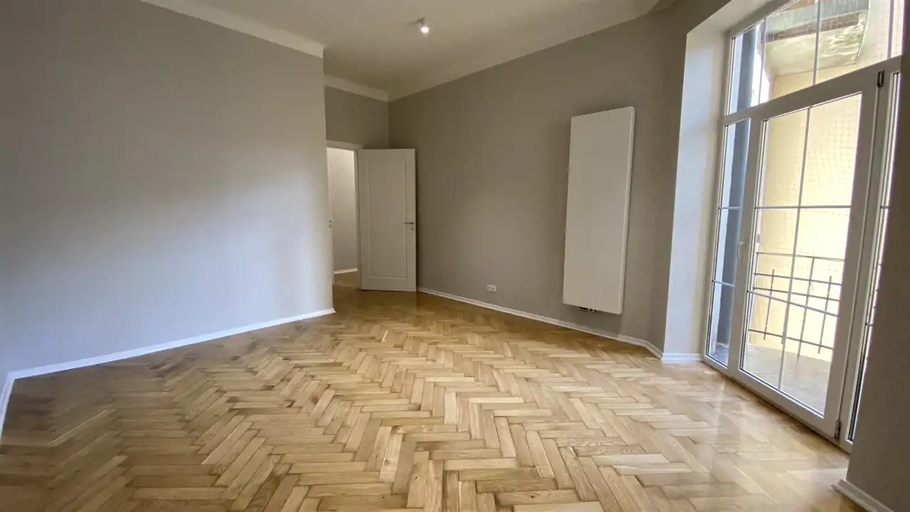 podłogi: w kuchni - gres, w pokojach i przedpokoju – wycyklinowany ponad 100-letni dębowy parkiet, w łazience – panele winylowe.