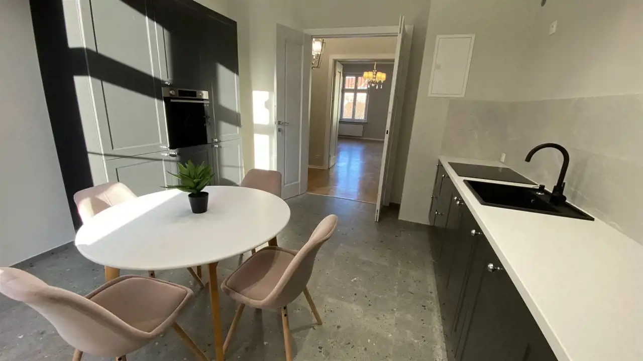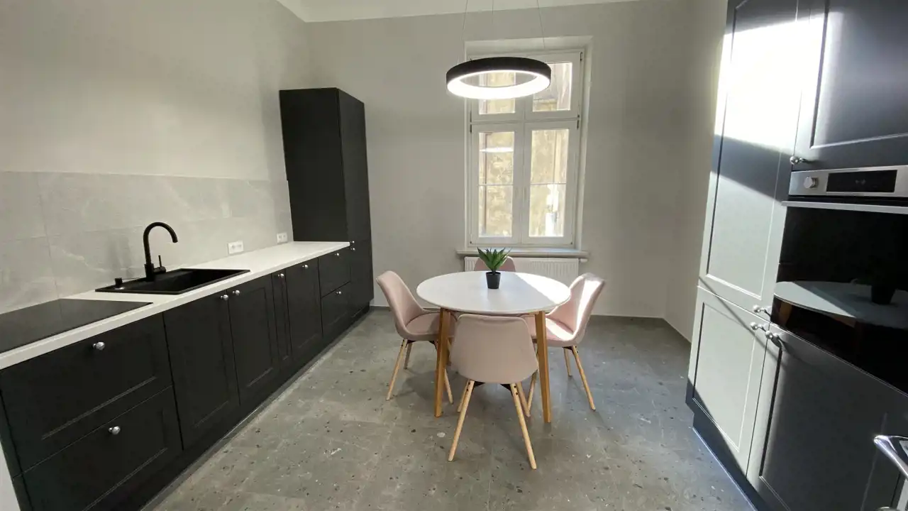 umeblowanie: kuchenne w zabudowie ze sprzętem AGD: zmywarka, piekarnik marki: SAMSUNG, płyta indukcyjna marki: SHARP, lodówko – zamrażarka, okrągły stół + 4 krzesła (wszystko nowe).