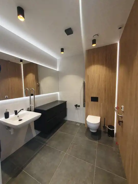 Toalety wykończone, znajdują się w części wspólnej w budynku.