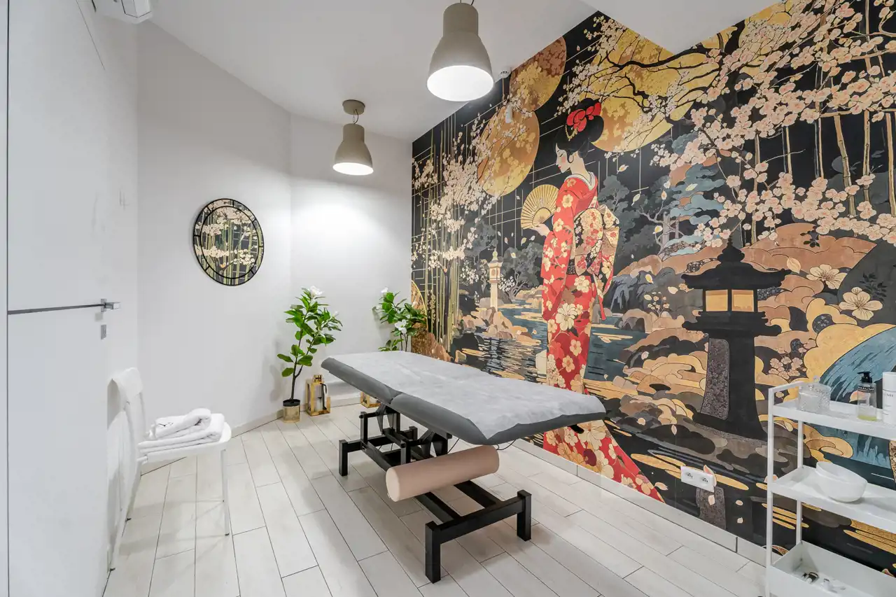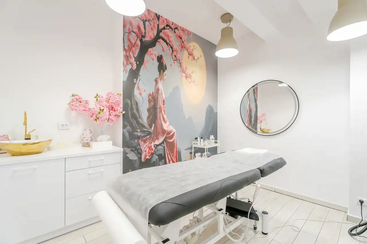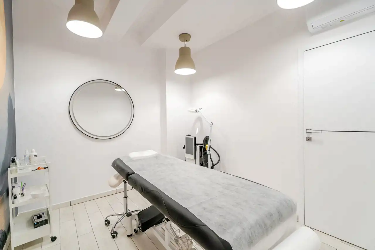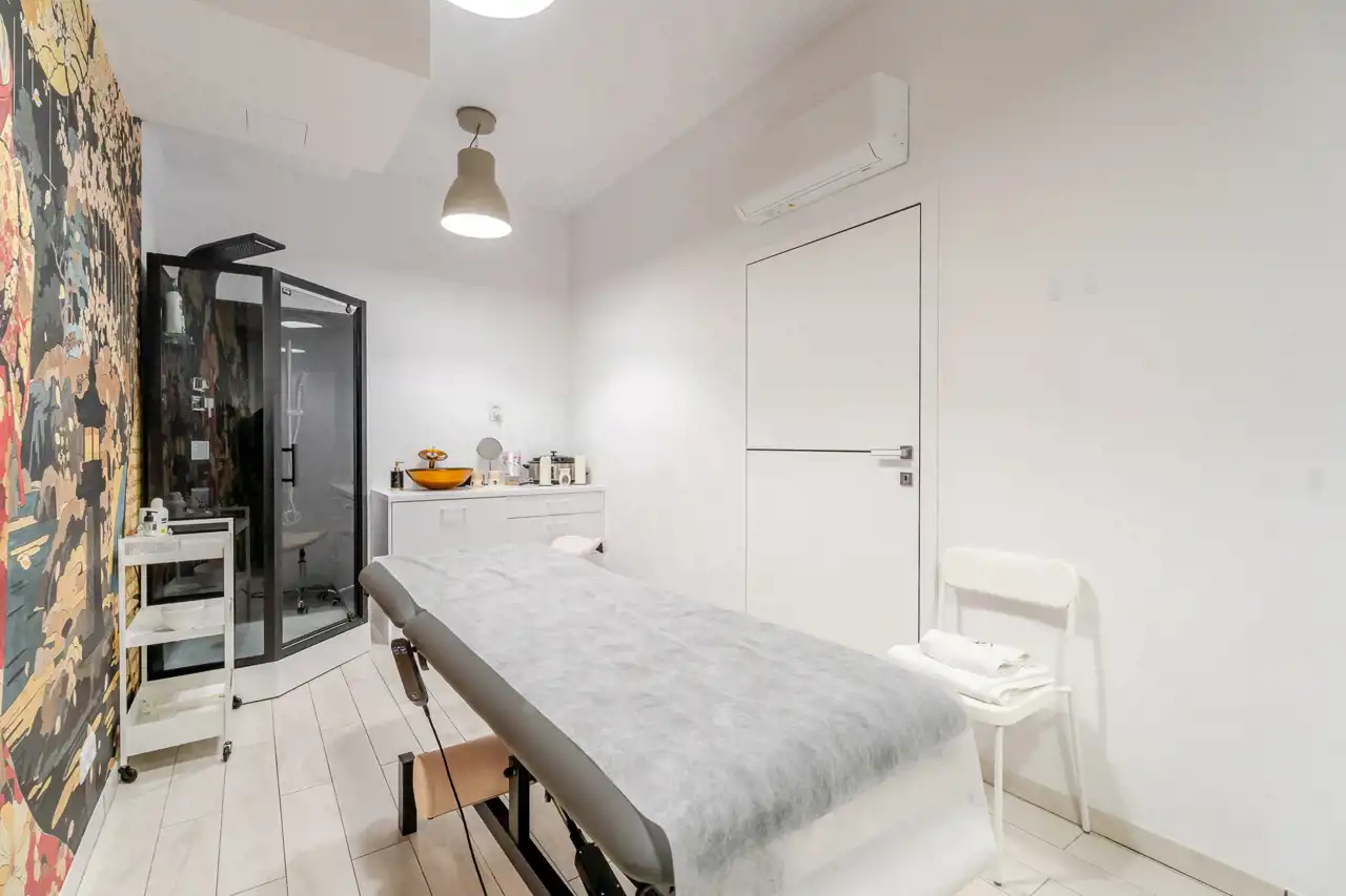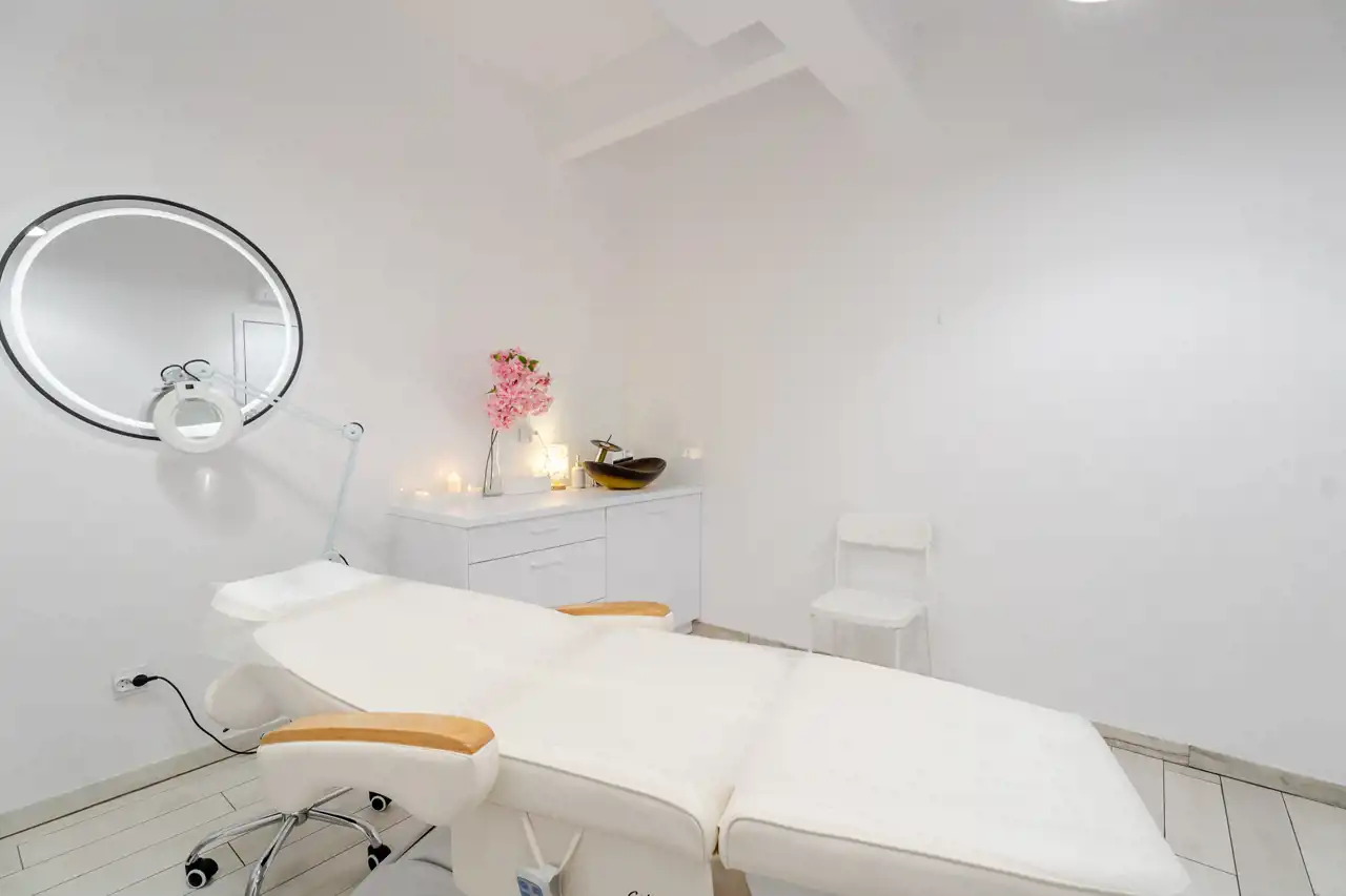 4 niezależne, w pełni wyposażone gabinety zabiegowe (każdy z klimatyzacją, meblami, umywalką, fotelem oraz leżanką kosmetyczną),