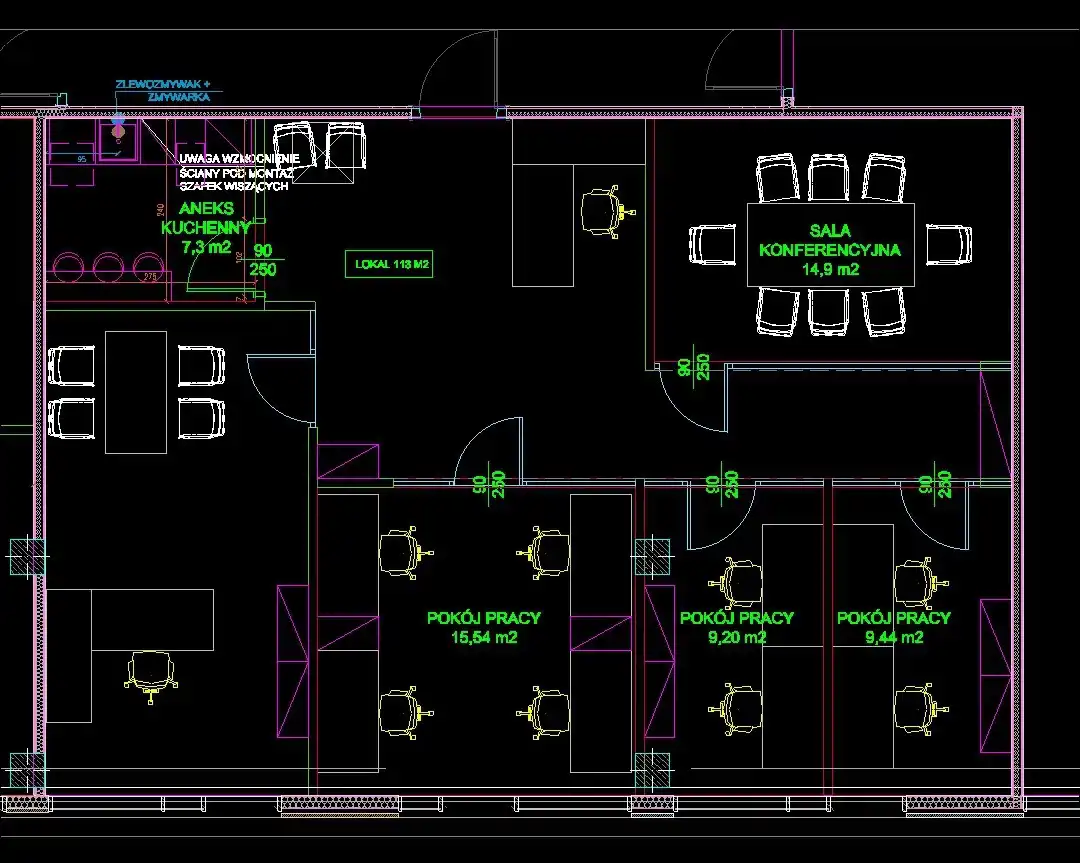Lokal składa się z: recepcji z komunikacją, 4 pokoi, sali konferencyjnej, aneksu kuchennego oraz serwerowni. Na piętrze dostępne toalety.