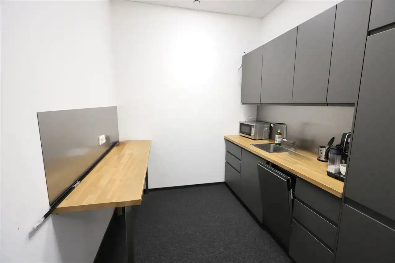Na podłodze wykładzina biurowa oraz gres, ściany pomalowane na biało. Aneks kuchenny umeblowany i wyposażony w sprzęt AGD. Pozostałe meble należą do najemcy.