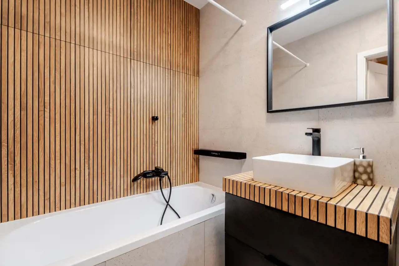 Bathroom with a bathtub and built-in washer and dryer