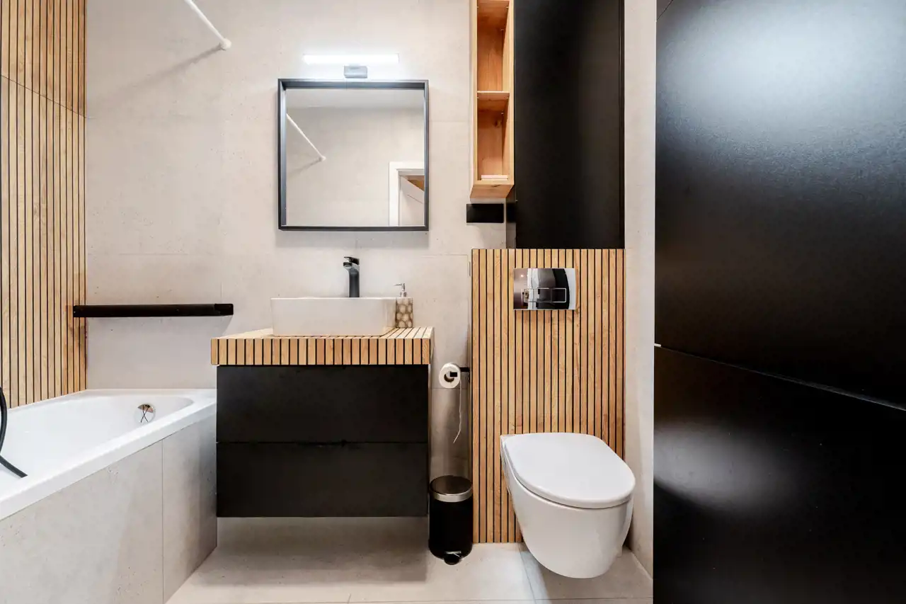 Bathroom with a bathtub, washbasin, toilet, and built-in washer and dryer