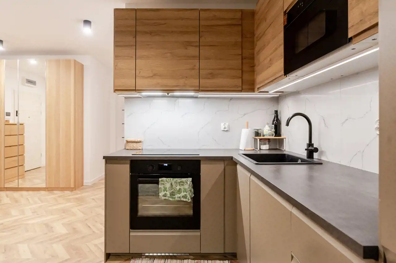 Built-in kitchen with full household appliances (induction hob, oven, dishwasher, hood, microwave)
