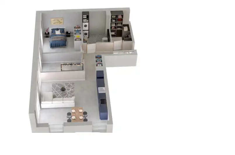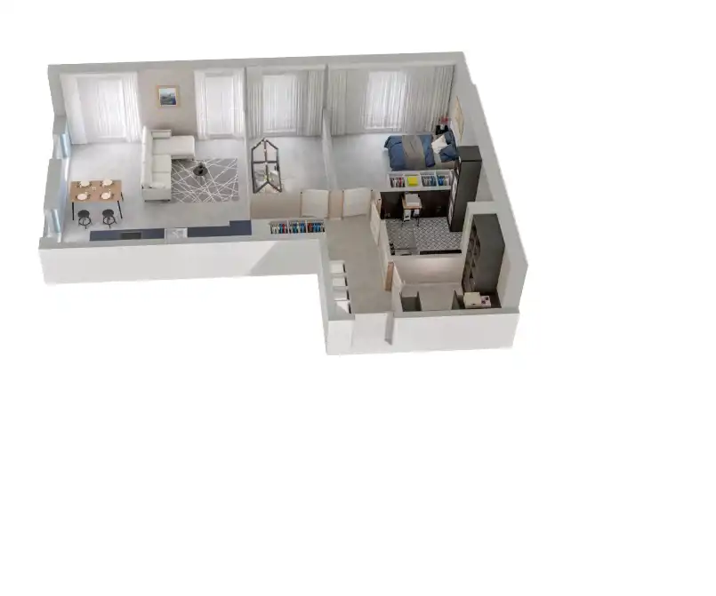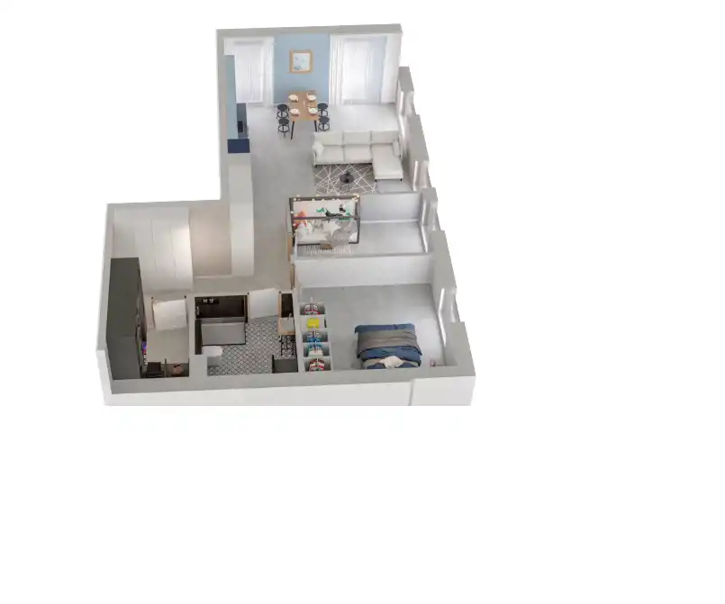 Mieszkanie składające się z salonu z aneksem kuchennym, dwóch sypialni, przedpokoju, garderoby oraz łazienki.