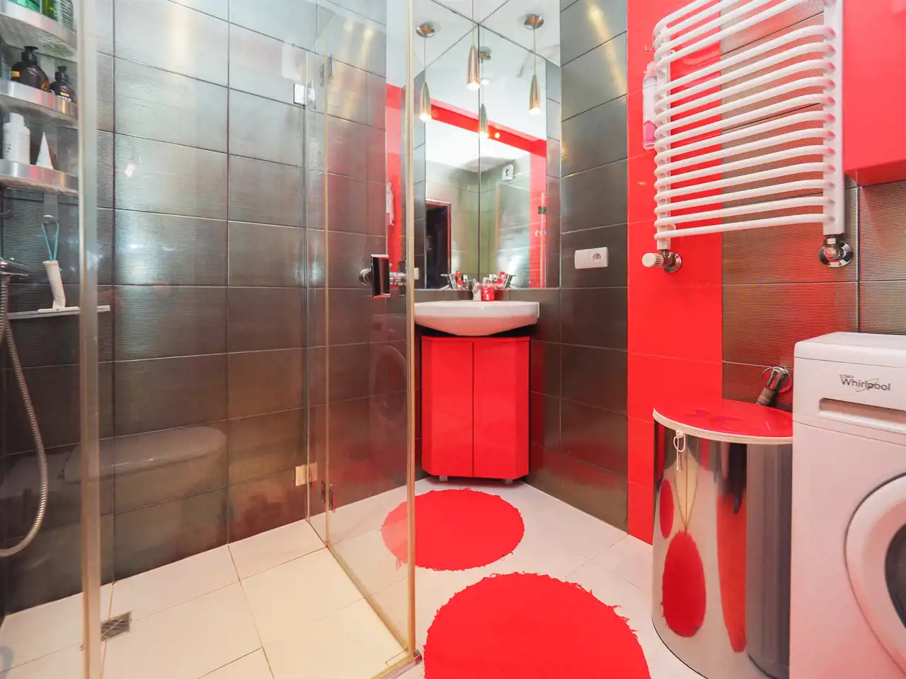 – łazienka z prysznicem, WC, umywalką i pralką,