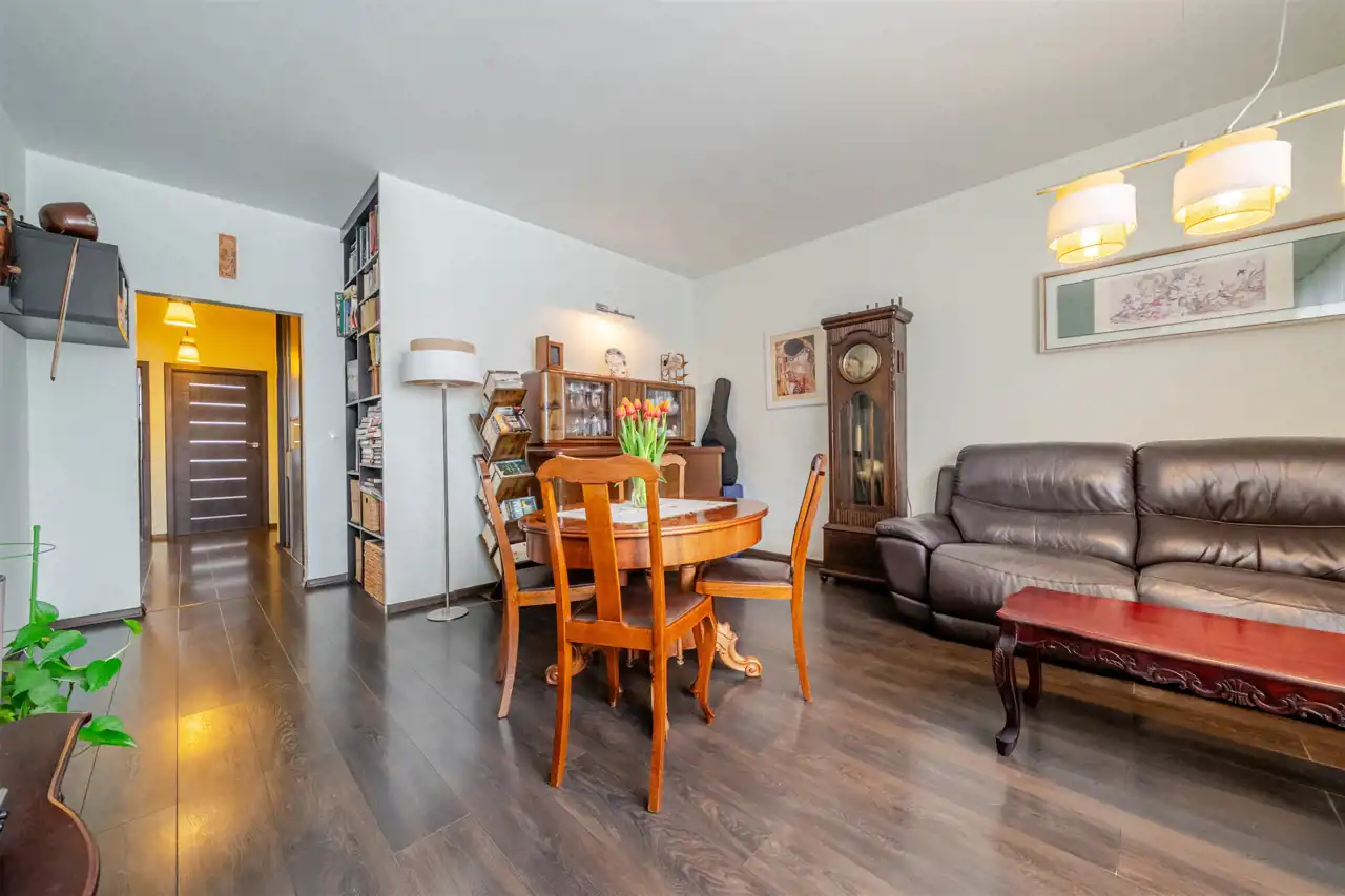Powierzchnia użytkowa mieszkania wynosi 84,08 m2. W skład mieszkania wchodzi przestronny salon o pow.: 22,17 m2, z wyjściem na balkon o południowej ekspozycji, 2 sypialnie (12,72 m2 i 12,53 m2), oddzielna kuchnia z oknem o pow. 10,12 m2; łazienka (4,25 m2), oddzielne wc, przedpokój oraz wewnętrzna klatka schodowa znajdująca się na poziomie parteru (wejście do mieszkania) i poziomie 1 piętra. Ekspozycja okien w salonie i kuchni - południowa, w sypialniach - północna.