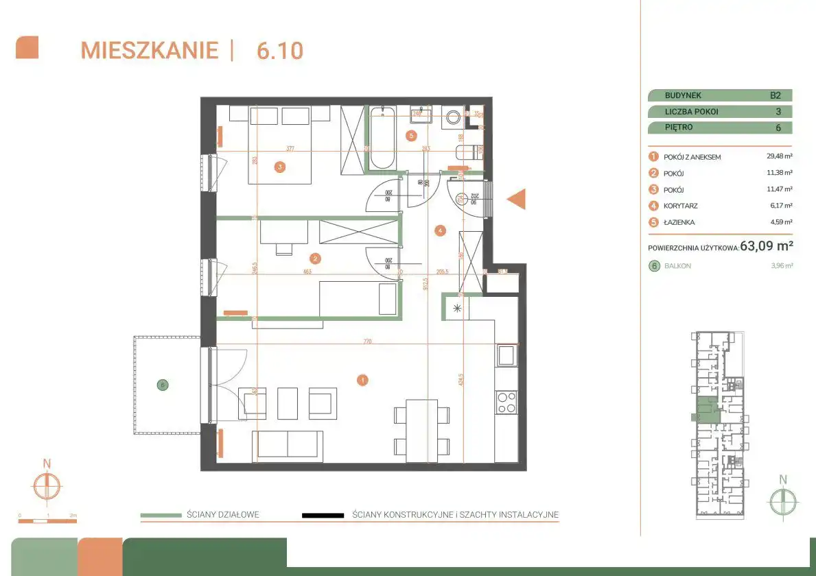 Oferowane mieszkanie to 3- pokoje o powierzchni 63,09 m ², zlokalizowane na VI piętrze.