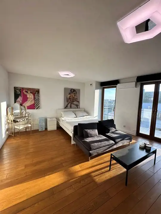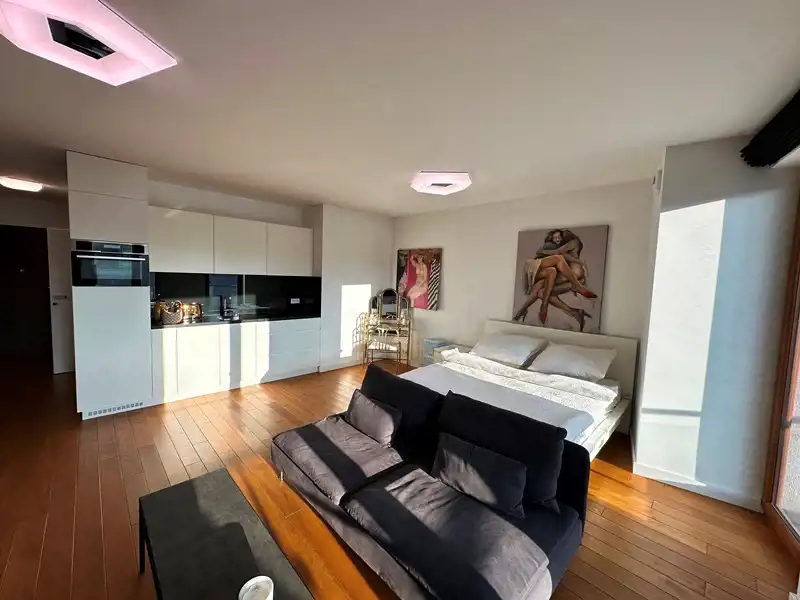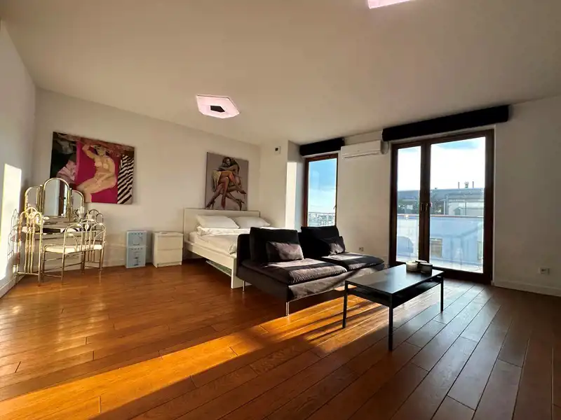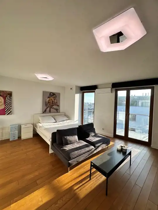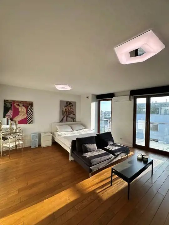 - duże studio z wyjściem na widokowy balkon ( istnieje możliwość wydzielenia ścianką działową sypialni)