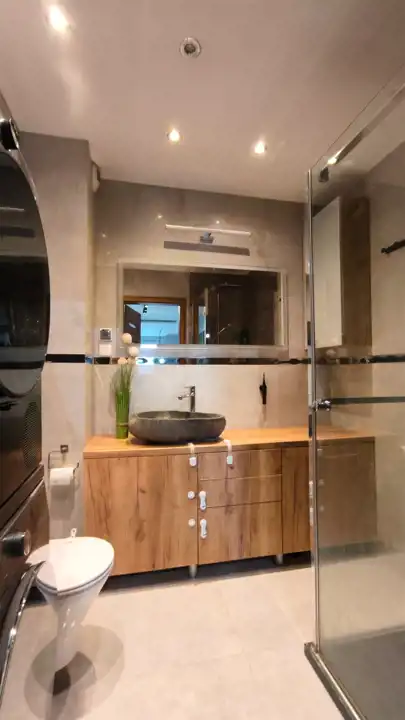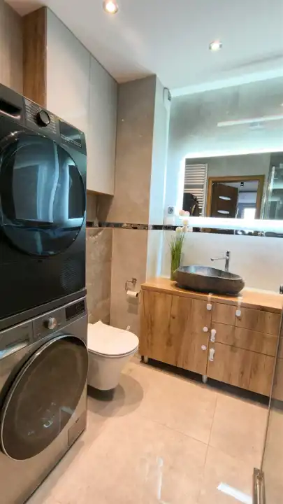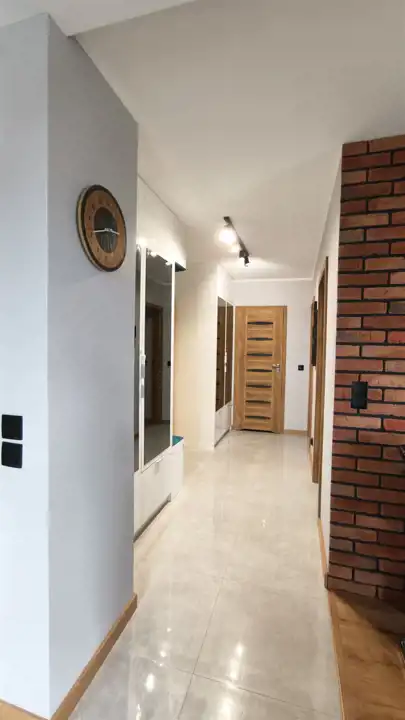 Mieszkanie jest gotowe do zamieszkania, wykończone z dbałością o detale. W całym lokalu zastosowano wysokiej jakości zabudowę meblową wykonaną na wymiar (lakierowane fronty), co pozwala na maksymalne wykorzystanie przestrzeni. Kuchnia została wyposażona w funkcjonalną wyspę, zwiększającą komfort użytkowania.